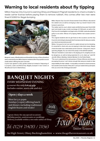 May 2025 | Phonebox Magazine 1160 High Street, Olney Buckinghamshire %u2022 www.the4pillarsrestaurant.co.ukFour PillarsTandoofi Restaurant20%discount on takeawaysTel: 01234 714083 / 711563BANQUET NIGHTS4 courses for only %u00a316.95 p/pIncludes starter, main side and rice EVERY WEDNESDAY EVENINGMon-Sat 5-11.30pmSundays (1-11pm) off ering lunch and dinner, including traditional English Roasts and steaks!Open 7 days a weekA great choice for any special occasions:Birthday parties, anniversaries or weddingsDelivery available within a two mile radius of OlneyWarning to local residents about fl y tipping Milton Keynes City Council is warning Olney and Newport Pagnell residents to check a trader%u2019s waste carrier license before paying them to remove rubbish, this comes after two men were fi ned %u00a33,000 for illegal dumping.Benjamin Lewis, of Bedfordshire and Daniel McCartney, of Stony Stratford were contacted by two Milton Keynes residents after they spotted a social media advert off ering the pair%u2019s services. A price was agreed to clear garden waste but instead of disposing of it properly, Lewis and McCartney illegally dumped it near homes at Woodhouse Court in Stantonbury.Milton Keynes City Council%u2019s Environmental Crime Offi cers discovered the rubbish and, as well as arranging a clear-up, traced it back to the homes it came from. The matter went to court, where Lewis and McCartney were fi ned %u00a3320 each and made to pay a victim surcharge of %u00a3128 each, as well as the City Council%u2019s investigation and legal costs of %u00a32,000. Lewis also pleaded guilty to one other off ence of fl y tipping. Neither had a waste carrier%u2019s license.The original residents did not get fi ned on this occasion, but the City Council is reminding local people that if someone else fl y-tips your waste, you may be prosecuted yourself. While a %u2018too good to be true%u2019 price for waste removal can be tempting, it%u2019s essential to check who you are paying to take items away. Always check the trader has a valid waste carrier%u2019s license %u2013 if they don%u2019t, they%u2019re operating illegally. You can check this easily on the GOV.UK website. %u201cWe won%u2019t hesitate to crack down on fl y-tipping as it%u2019s unsightly and can be dangerous, as well as being expensive for us to clean up,%u201d said Cllr Jennifer Wilson-Marklew, Cabinet Member for the Public Realm.%u201cThe court understood the seriousness of these off ences and this pair are paying the price. I can%u2019t stress enough that everyone needs to take responsibility for their rubbish %u2013 it only takes a moment to check someone has a waste carrier license. If they don%u2019t, and your waste ends up dumped, then you are at risk of being prosecuted.%u201d