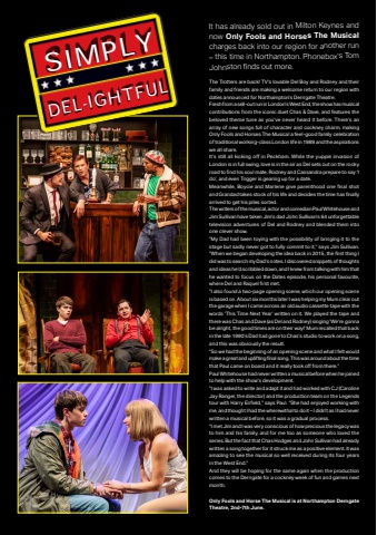 12 Phonebox Magazine | May 2025It has already sold out in Milton Keynes and now Only Fools and Horses The Musical charges back into our region for another run %u2013 this time in Northampton. Phonebox%u2019s Tom Johnston fi nds out more.The Trotters are back! TV%u2019s lovable Del Boy and Rodney and their family and friends are making a welcome return to our region with dates announced for Northampton%u2019s Derngate Theatre.Fresh from a sell-out run in London%u2019s West End, the show has musical contributions from the iconic duet Chas & Dave, and features the beloved theme tune as you%u2019ve never heard it before. There%u2019s an array of new songs full of character and cockney charm, making Only Fools and Horses The Musical a feel-good family celebration of traditional working-class London life in 1989 and the aspirations we all share. It%u2019s still all kicking off in Peckham. While the yuppie invasion of London is in full swing, love is in the air as Del sets out on the rocky road to fi nd his soul mate, Rodney and Cassandra prepare to say %u2018I do%u2019, and even Trigger is gearing up for a date.Meanwhile, Boycie and Marlene give parenthood one fi nal shot and Grandad takes stock of his life and decides the time has fi nally arrived to get his piles sorted.The writers of the musical, actor and comedian Paul Whitehouse and Jim Sullivan have taken Jim%u2019s dad John Sullivan%u2019s 64 unforgettable television adventures of Del and Rodney and blended them into one clever show.%u201cMy Dad had been toying with the possibility of bringing it to the stage but sadly never got to fully commit to it,%u201d says Jim Sullivan. %u201cWhen we began developing the idea back in 2015, the fi rst thing I did was to search my Dad%u2019s notes. I discovered snippets of thoughts and ideas he%u2019d scribbled down, and I knew from talking with him that he wanted to focus on the Dates episode, his personal favourite, where Del and Raquel fi rst met. %u201cI also found a two-page opening scene, which our opening scene is based on. About six months later I was helping my Mum clear out the garage when I came across an old audio cassette tape with the words %u2018This Time Next Year%u2019 written on it. We played the tape and there was Chas and Dave (as Del and Rodney) singing %u2018We%u2019re gonna be alright, the good times are on their way!%u2019 Mum recalled that back in the late 1990%u2019s Dad had gone to Chas%u2019s studio to work on a song, and this was obviously the result. %u201cSo we had the beginning of an opening scene and what I felt would make a great and uplifting fi nal song. This was around about the time that Paul came on board and it really took off from there.%u201dPaul Whitehouse had never written a musical before when he joined to help with the show%u2019s development.%u201cI was asked to write and adapt it and had worked with CJ (Caroline Jay Ranger, the director) and the production team on the Legends tour with Harry Enfi eld,%u201d says Paul. %u201cShe had enjoyed working with me, and thought I had the wherewithal to do it %u2013 I didn%u2019t as I had never written a musical before, so it was a gradual process. %u201cI met Jim and I was very conscious of how precious the legacy was to him and his family, and for me too as someone who loved the series. But the fact that Chas Hodges and John Sullivan had already written a song together for it struck me as a positive element. It was amazing to see the musical so well received during its four years in the West End.%u201dAnd they will be hoping for the same again when the production comes to the Derngate for a cockney week of fun and games next month.Only Fools and Horse The Musical is at Northampton Derngate Theatre, 2nd-7th June.SIMPLYDEL-IGHTFUL