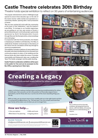 20 Phonebox Magazine | May 2025Castle Theatre celebrates 30th BirthdayTheatre holds special exhibition to refl ect on 30 years of entertaining audiences. The popular entertainment centre in Wellingborough opened its doors three decades ago on the site of the town%u2019s former cattle market and operated as a community theatre, opening with a local production of %u2018Annie%u2019. %u201cWe are now coming full circle with the community at the heart of this celebration,%u201d said the theatre%u2019s Luke White. %u201cIn homage to our humble beginnings, we are putting on our very own version of Annie, a part professional, part community project, generously sponsored by North Northamptonshire Council, through Discover Northamptonshire, and proceedings are in full swing.%u201dIn conjunction with the Annie production, the theatre is displaying an exhibition until Saturday, 31st May, to celebrate its %u2018timeline%u2019 and look back on the history of the venue, from its conception all the way through to recent accomplishments.The exhibition includes a plethora of memorabilia from the public who have donated items from the past from community projects to plans of the building and the famous faces who have visited the venue. It includes memorabilia and Parkwood%u2019s take over, recalling the %u2018Save The Castle campaign%u2019 and the public backing. Castle Theatre%u2019s celebration exhibition will be open to the public for free and can be accessed via the Box Offi ce, opening hours 10am-3pm.