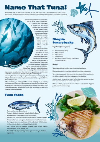 28 Phonebox Magazine | May 2025Tuna is an important food commodity, but it faces many challenges. It%u2019s a popular fi sh that makes a variety of wonderful dishes and is enjoyed all over the world. But increasing demand leads to overfi shing. Estimates predict that, by 2027, the canned tuna market could be wor th $11.89 b i l l i o n ( %u00a3 8 . 9 9 billion).Industry estimates show that nearly a quarter of tuna stocks are being overfi shed. Separately, the catching of tuna can lead to other problems %u2013 some fi shermen%u2019s gear can entangle seabirds, sharks and marine mammals such as dolphins. World Tuna Day aims to highlight these issues and encourage fisheries to be more responsible. Already, more than half of the global tuna catch is now certifi ed as sustainable or at least working towards that goal. And many fi sheries have signed up for fi sheries improvement projects (FIPs) that help them fi nd a way towards sustainability, says the Marine Stewardship Council.In the meantime, you can support the work of campaigners by cooking sustainable tuna not only on World Tuna Day but right through the year. Most fi sh cans and other packaging will tell you whether the catch is from a sustainable source and by using those, you are helping to keep tuna stocks at manageable levels.Tuna facts%u2022 There are fi ve main types of tuna%u2022 They are: Skipjack, Albacore, Yellowfi n, Bluefi n, Bigeye%u2022 Skipjack tuna is the smallest and most abundant%u2022 Yellowfi n tuna can grow to more than two metres and weigh 200kg%u2022 Almost half of tuna is caught in the Western Central Pacifi c Ocean%u2022 The biggest tuna ever caught was off Nova Scotia in 1979. It was a 12-foot Atlantic Bluefi n, weighing 679kg (1,497lb)%u2022 For a tuna to gain 1kg in weight it needs to eat around 10kg of mid-size fi sh or 100kg of small fi sh%u2022 An adult female Tropical Skipjack can spawn as many as 2 million eggs a day World Tuna Day is celebrated this year on 2nd May. Each year campaigners use the notable day to raise awareness about ending overfi shing and safeguarding tuna supplies for the future.Name That Tuna!Simple tuna steaksIngredients (for two people)%u2022 2 tuna steaks (6-8 oz)%u2022 2 tbsp olive oil %u2022 2 tbsp butter%u2022 1 fresh lemon%u2022 8 oz chopped fresh parsley or 4 oz dried %u2022 1/2 tbsp dried dill MethodWarm up a skillet at medium heat the olive oil and butter.Place tuna steaks in a bowl and add the lemon juice and parsley.Turn and toss a couple of times to get them coated then lay them in the skillet and add in the juice and parsley from the bowl.Cook to taste %u2013 they can be eaten soft and almost raw but can also take more hear to become fi rmer and meatier.Plate up with the juices from the pan and serve with saut%u00e9 or chipped potatoes and a lemon wedge.