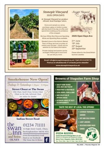 May 2025 | Phonebox Magazine 29www.brownsofstagsden.co.ukFollow us on Facebook and Instagram for updatesManor Farm, Stagsden, Beds, MK43 8SHTue - Thurs 10am - 4pm, Fri 10am - 5pm, Sat 9am - 3pm%u2022 LICENSED TEAROOM & GARDEN%u2022 HOT AND COLD DRINKS%u2022 LIGHT LUNCHES%u2022 DELICIOUS HOME MADE CAKES01234 822330Browns of Stagsden Farm Shop %u2022 QUALITY HOME REARED LOCAL MEAT AND POULTRY%u2022 FRESH FRUIT & VEGETABLES %u2022 LOCAL BEERS, CIDER & WINE%u2022 WIDE SELECTION OF ARTISAN CHEESE%u2022 EXTENSIVE RANGE OF TASTY ACCOMPANIMENTS TASTE THE BEST OF LOCAL THIS SPRING!12 High Street South, Olney, Buckinghamshire MK46 4AA01234 711111Fridays & Saturdays 5.30pm %u2013 8.30pmStreet Chaat at The SwanChit Chaat, Small Chaat, Serious ChaatChaat on the Side, Informal ChaatSee online for details! Smokehouse Now Open!www.theswanolney.co.ukFind us on FacebookThe Swan Inn & BistroIndian Street FoodStonepit Vineyard2025 OPEN DAYSEmail: info@stonepitvineyard.co.uk / Call: 07410 976772Find us on what3words /// at beats.junior.steadier www.stonepitvineyard.co.ukAt Stonepit Vineyard we produce vibrant, local boutique wines.Come and sample our wines, purchase a glass or bottle to enjoy with the food of the day on offer, and spend time soaking up the ambiance of the vineyard.We have White, Red, Rose and Sparkling White and Sparkling Rose available.Situated close to the Historic Market Town of Olney we host a number of events over the year %u2013 check out our website for the latest information. Private tastings and events can be arranged. Please get in touch and we can tell you more.2025 Open Days Are:21st June19th July23rd August20th SeptemberPlease allow for the Great British Summer weather