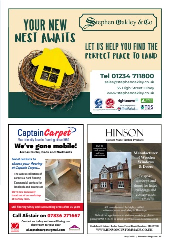 May 2025 | Phonebox Magazine 35Licensed by both NAEA and ARLATel 01234 711800sales@stephenoakley.co.uk35 High Street Olneywww.stephenoakley.co.ukLET US HELP YOU FIND THE PERFECT PLACE TO LANDYOUR NEWNEST AWAITSLicensed by both NAEA and ARLAPAS 24 compliant for new builds and barn conversionsAll manufactured by highly skilled craftsmen at our workshop in Hanslope To book an appointment to visit our workshop, pleasephone 01908 516333 or email info@hinsoncustommade.co.ukWorkshop 2, Spinney Lodge Farm, Forest Road, Hanslope, MK19 7DEWWW.HINSONCUSTOMMADE.CO.UKManufacturer of Wooden Windows & DoorsBespoke windows and doors for listed buildings and conservation areas%u2022 The widest collection of carpets & hard flooring%u2022 Commercial services for landlords and businessesWe%u2019re now exclusively based out of our workshop at Northey Farm.Call Alistair on 07836 271667We%u2019ve gone mobile!Across Bucks, Beds and Northantsal.captaincarpet@gmail.comContact us today and we will bring our showroom to your doorGreat reasons to choose your flooring at Captain Carpet...Still flooring Olney and surrounding areas after 35 years