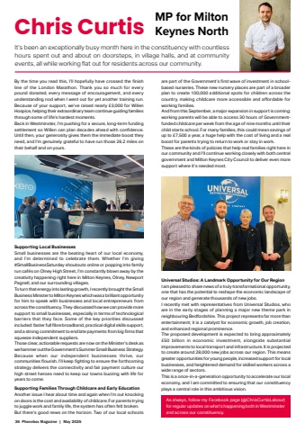 36 Phonebox Magazine | May 2025It%u2019s been an exceptionally busy month here in the constituency with countless hours spent out and about on doorsteps, in village halls, and at community events, all while working fl at out for residents across our community.By the time you read this, I%u2019ll hopefully have crossed the fi nish line of the London Marathon. Thank you so much for every pound donated, every message of encouragement, and every understanding nod when I went out for yet another training run. Because of your support, we%u2019ve raised nearly %u00a33,000 for Willen Hospice, helping their extraordinary team continue guiding families through some of life%u2019s hardest moments.Back in Westminster, I%u2019m pushing for a secure, long-term funding settlement so Willen can plan decades ahead with confi dence. Until then, your generosity gives them the immediate boost they need, and I%u2019m genuinely grateful to have run those 26.2 miles on their behalf and on yours.Supporting Local BusinessesSmall businesses are the beating heart of our local economy, and I%u2019m determined to celebrate them. Whether I%u2019m giving #SmallBusinessSaturday shoutouts online or popping into family run caf%u00e9s on Olney High Street, I%u2019m constantly blown away by the creativity happening right here in Milton Keynes, Olney, Newport Pagnell, and our surrounding villages.To turn that energy into lasting growth, I recently brought the Small Business Minister to Milton Keynes which was a brilliant opportunity for him to speak with businesses and local entrepreneurs from across the constituency. They discussed how we can provide more support to small businesses, especially in terms of technological barriers that they face. Some of the key priorities discussed included: faster full fi bre broadband, practical digital skills support, and a strong commitment to end late payments from big fi rms that squeeze independent suppliers.Those clear, actionable requests are now on the Minister%u2019s desk as we hammer out the Government%u2019s Summer Small Business Strategy.Because when our independent businesses thrive, our communities fl ourish. I%u2019ll keep fi ghting to ensure the forthcoming strategy delivers the connectivity and fair payment culture our high street heroes need to keep our towns buzzing with life for years to come.Supporting Families Through Childcare and Early EducationAnother issue I hear about time and again when I%u2019m out knocking on doors is the cost and availability of childcare. For parents trying to juggle work and family life, the system has often felt broken.But there%u2019s good news on the horizon. Two of our local schools Chris Curtis MP for MiltonKeynes Northare part of the Government%u2019s fi rst wave of investment in schoolbased nurseries. These new nursery places are part of a broader plan to create 100,000 additional spots for children across the country, making childcare more accessible and aff ordable for working families.And from this September, a major expansion in support is coming: working parents will be able to access 30 hours of Governmentfunded childcare per week from the age of nine months until their child starts school. For many families, this could mean savings of up to %u00a37,500 a year, a huge help with the cost of living and a real boost for parents trying to return to work or stay in work.These are the kinds of policies that help real families right here in our community and I%u2019ll continue working closely with both central government and Milton Keynes City Council to deliver even more support where it%u2019s needed most.Universal Studios: A Landmark Opportunity for Our RegionI am pleased to share news of a truly transformational opportunity, one that has the potential to reshape the economic landscape of our region and generate thousands of new jobs.I recently met with representatives from Universal Studios, who are in the early stages of planning a major new theme park in neighbouring Bedfordshire. This project represents far more than entertainment; it is a catalyst for economic growth, job creation, and enhanced regional prominence.The proposed development is expected to bring approximately %u00a350 billion in economic investment, alongside substantial improvements to local transport and infrastructure. It is projected to create around 28,000 new jobs across our region. This means greater opportunities for young people, increased support for local businesses, and heightened demand for skilled workers across a wide range of sectors.This is a once-in-a-generation opportunity to accelerate our local economy, and I am committed to ensuring that our constituency plays a central role in this ambitious vision.As always, follow my Facebook page (@ChrisCurtisLabour) for regular updates on what%u2019s happening both in Westminster and across our constituency.