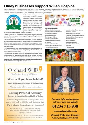 40 Phonebox Magazine | May 2025We make the process quick and easy with a fi xed cost of %u00a3360 each or %u00a3580 for both (including fees)Why is a lasting Power of Attorney important?You can only set up a Lasting Power of Attorney when you have mental capacity. Once you%u2019ve lost capacity, it%u2019s too late.Remember even with an LPA you have not lost control of your fi nances while you are still able to look after them.For more information pleasecall us or visit our website01234 713 938www.orchardwills.co.ukOrchard Wills, Unit 2 Stanley Court, Bucks, MK46 5NHLasting Power of AttorneyProperty & Financial Afi airs or Health & WelfareWhat will you leave behind?Single Will from %u00a3120 %u2022 Mirror Wills from %u00a3180A friendly service, office or home visits availableRon Hall being congratulated on being the longest-serving member of the Society of Will WritersOlney businesses support Willen Hospice The kind hearted and generous businesses in Olney are helping to raise much needed funds for Olney Open Gardens, on 14th-15th June, by sponsoring the event. 100% of the money raised in sponsorship, ticket sales and the raffl e will go to Willen and the event itself is going to be one of those great Olney weekends, with many more gardens open, Morris Dancing in front of the Carlton House Club, teas and cake at the Sutcliff e Baptist Church, champagne in one of the gardens and a massive raffl e prize. All the sponsors will have their logos on the tickets.%u201cCharity events like the Olney gardens bring people together, fostering a sense of community and shared purpose,%u201d says Lois Twigden, one of the major sponsors.%u201cOur sponsorship is not just about fi nancial support; it%u2019s about building a stronger, more united community. Twigden Asset are proud to sponsor Willen Hospice which provides essential care and support to those facing life-limiting illnesses, ensuring dignity and comfort for patients and their families.%u201cIt%u2019s support like this, from businesses like these, that allows Willen to do the work our community values so highly,%u201d says Marihelen Esam, one of the Willen Hospice Trustees. %u201cAt the moment we receive no funding whatsoever from the NHS or the government for our Willen at Home service. We can%u2019t provide this much needed service to the people of Olney without their generous support.%u201dIf there are any other local businesses wishing to become sponsors, contact: Marihelen.esam@willen-hospice.co.uk.The sponsors include: J Garrard & Allen Solicitors, Sue Gilbert Gardens By Design, JS Designs & Interiors,Davis Optometrists, Soul Garages of Olney, Moodley Dental Practice, Twigden Asset Management,CT Wilson, Marcus Jordan & Co Ltd, Stefanie Price Wealth Planning, Oval Park Construction, Michael Graham Estate Agents, Desmond J Smail, Willow Veterinary CentresI Coleman Plumbing and Heating, Stephen Oakley Estate Agents, Roseview Windows, Acorn Nurseries, Alban Hill NurseriesAnd Olney Pilates Studio, Hillier HillCaptain Carpet