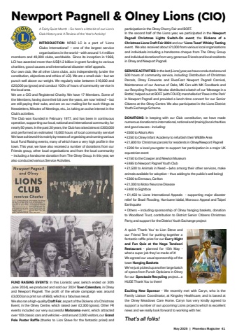 May 2025 | Phonebox Magazine 41A Fairly Quiet Month %u2013 So here%u2019s a little bit of our Lion%u2019s Club History and A Review of the Year%u2019s Activity!INTRODUCTION: NP&O LC is a part of %u2018Lions Clubs International%u2019 %u2013 one of the largest service organisations in the world %u2013 with around 1.4 million members and 49,000 clubs, worldwide. Since its inception in 1968, LCI has awarded more than US$1.2 billion in grant funding to various charities, good causes and International disaster relief appeals.Our own club, like all other Lions clubs, acts independently, (under the constitution, objectives and ethics of LCI). We are a small club %u2013 but we punch well above our weight. We regularly raise between %u00a316,000 and %u00a320,000 pa (gross) and conduct 100%u2019s of hours of community service in the local area. We are a CIO and Registered Charity. We have 17 Members. Some of the Members, having done their bit over the years, are now %u2018retired%u2019 %u2013 but are still paying their subs, and are on our mailing list for such things as Newsletters, Minutes of Meetings, etc., i.e. taking an active interest in the Club%u2019s activities.The Club was founded in February 1977, and has been in continuous operation, supporting our local, national and international community, for nearly 50 years. In the past 20 years, the Club has raised almost %u00a3300,000 and performed an estimated 15,000 hours of local community service! We have achieved this mainly by means of organising and running various local Fund Raising events, many of which have a very high profi le in the town. This year, we have also received a number of donations from our Friends group, other local organisations and from the local community %u2013 including a handsome donation from The Olney Group. In this year, we also conducted various Service Activities. FUND RAISING EVENTS: In this Lionistic year, (which ended on 30th June 2024), we produced and sold our 2024 Town Calendars, in Olney and Newport Pagnell. The profi t of the whole campaign was around %u00a33,000 (on a print run of 850), which is a fabulous result. We also ran a high-quality Craft Fair, as part of the Dickens of a Christmas Event, in the Olney Centre, which raised over %u00a32,300 (gross). Other FR events included our very successful Motorama event, which attracted over 100 classic cars and vehicles %u2013 and around 2,000 visitors, our Grand Pele Poster Raffl e (thanks to Lion Steve for the fantastic prize!) and Newport Pagnell & Olney Lions (CIO)participation in the Olney Cherry Fair and BOFF.In the second half of the Lions year, we participated in the Newport Pagnell Christmas Lights Switch-On event; the Dickens of a Christmas Lions Craft Fair 2024 and our %u2018Lions Toast%u2019 Whisky Tastingevent. We also received about %u00a31,000 from various local organisations and individuals including a handsome cheque from The Olney Group and individual donations from very generous Friends and local residents in Olney and Newport Pagnell.SERVICE ACTIVITIES: In the last (Lions) year, we have conducted around 500 hours of community service, including: Distribution of Christmas Parcels, Olney Fireworks and RiverFest Newport Pagnell Carnival, Maintenance of our Avenue of Oaks, MK Can with MK Foodbank and our Recycling Projects. We also distributed a batch of our %u2018Message in a Bottle%u2019; helped out at BOFF (with FOLIO); marshalled at %u2018Paws in the Park%u2019 in Newport Pagnell and provided a lunch-time concert for our Senior Citizens at the Olney Centre. We also participated in the Lions District Youth Exchange Scheme. DONATIONS: In keeping with our Club constitution, we have made numerous donations to international, national and (mainly) local charities and good causes - including: %u2022 %u00a3500 to Ailsa%u2019s Aim%u2022 %u00a3250 to Olney Infant Academy to refurbish their Wildlife Area%u2022 %u00a31,800 for Christmas parcels for residents in Olney/Newport Pagnell%u2022 %u00a3200 for a local youngster to support her participation in a major UK equestrian event%u2022 %u00a3150 to the Cowper and Newton Museum %u2022 %u00a3485 to Newport Pagnell Youth Club%u2022 %u00a31,500 to Animals in Need %u2013 (who among their other services, make animals available for adoption %u2013 thus adding to the public%u2019s well being)%u2022 %u00a3300 to Emmaus, Carlton%u2022 %u00a31,000 to Motor Neurone Disease%u2022 %u00a3400 to Sightbox%u2022 %u00a31,450 to Lions International Appeals - supporting major disaster relief for Brazil Flooding, Hurricane Idaliai, Morocco Appeal and Taipei Earthquake%u2022 Others %u2013 including sponsorship of Olney hanging baskets, donation to Woodland Trust, contribution to District Senior Citizens Christmas Party, and support for the District Youth Exchange projectA quick %u2018Thank You%u2019 to Lion Steve and our Friend Terri for putting together a fantastic raffl e prize for our Curry Night and Fun Quiz at the Naga Tandoori Restaurant - planned for 15th May - what a super job they%u2019ve made of it! We agreed our usual sponsorship of the town Hanging BasketsWe%u2019ve just picked up another large batch of specs from Punch Opticians in Olney for our Spectacle Recycling project... a HUGE Thank You to them!Exciting New Sponsor - We recently met with Caryn, who is the Family Liaison Coordinator, at Kingsley Healthcare, and is based at the Olney Meadows Care Home. Caryn has very kindly agreed to support a number of our upcoming Lions projects which is excellent news and we really look forward to working with her.That%u2019s all folks!