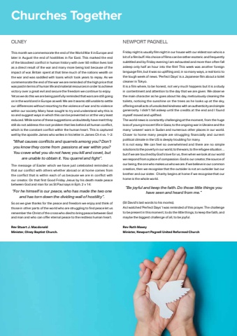 42 Phonebox Magazine | May 2025OLNEYThis month we commemorate the end of the World War II in Europe and later in August the end of hostilities in Far East. This marked the end of the bloodiest confl ict in human history with over 50 million lives lost as a direct result of the war and many more being lost because of the impact of war. Britain spent at that time much of the nations wealth on the war and was saddled with loans which took years to repay. As we commemorate the end of the war we are reminded of the high price that was paid in terms of human life and material resources in order to achieve victory over a great evil and secure the freedom we continue to enjoy. Yet as we do this we are being painfully reminded that wars are still going on in the world and in Europe as well. We are it seams still unable to settle our diff erences without resorting to the violence of war and to violence within our society. Many have sought to try and understand why this is so and suggest ways in which this can be prevented or at the very least reduced. While some of these suggestions undoubtedly have merit they still do not address the root problem that lies behind all human confl ict, which is the constant confl ict within the human heart. This is captured well by the apostle James who writes in his letter in James Ch 4 vs. 1-2:%u201cWhat causes confl icts and quarrels among you? Don%u2019t you know they come from passions at war within you? You crave what you do not have; you kill and covet, but are unable to obtain it. You quarrel and fi ght%u201d.The message of Easter which we have just celebrated reminded us that our confl ict with others whether abroad or at home comes from the confl ict that is within each of us because we are in confl ict with our creator. On that fi rst Good Friday Jesus by his death made peace between God and man for as St Paul says in Eph. 2 v 14:%u201cFor he himself is our peace, who has made the two one and has torn down the dividing wall of hostility%u201d.So as we give thanks for the peace and freedom we enjoy and think of those in other parts of the world who are struggling to fi nd peace let us remember the Christ of the cross who died to bring peace between God and man and who can off er eternal peace to the restless human heart.Rev Stuart J. MacdonaldMinister, Olney Baptist Church. NEWPORT PAGNELLFriday night is usually fi lm night in our house with our eldest son who is a bit of a fi lm buff . His choice of fi lms can be rather esoteric and frequently subtitled and by Friday evening I am exhausted and more than often fall asleep only half an hour into the fi lm! This week was another foreign language fi lm, but it was so uplifting and, in so many ways, a real tonic to the tough week of news. %u2018Perfect Days%u2019 is a Japanese fi lm about a toilet cleaner in Tokyo. It is a fi lm where, to be honest, not very much happens but it is a study in contentment and attention to the day that we are given. We observe the main character as he goes about his day, meticulously cleaning the toilets, noticing the sunshine on the trees as he looks up at the sky, off ering small acts of unsolicited kindness with an authenticity and simple generosity. I didn%u2019t fall asleep until the credits at the end and I found myself moved and uplifted.The world news is constantly challenging at the moment, from the huge loss of young innocent life in Gaza, to the ongoing war in Ukraine and the many %u2018unseen%u2019 wars in Sudan and numerous other places in our world. Closer to home many people are struggling fi nancially and current political climate in the US is deeply troubling for many. It is not easy. We can feel so overwhelmed and there are no simple solutions to the poverty in our world, to the wars, to the refugee situation%u2026but if we are touched by God%u2019s love for us, then when we look at our world we respond from a place of compassion. God is our creator, the source of our being, the one who makes us who we are. If we believe in our common creation, then we recognise that the outsider is not an outsider but our brother and our sister. Charity begins at home if we recognise that our home is the whole world.%u201cBe joyful and keep the faith. Do those little things you have seen and heard from me.%u201d (St David%u2019s last words to his monks). As I watched %u2018Perfect Days%u2019 I was reminded of this prayer. The challenge to be present in this moment, to do the little things, to keep the faith, and maybe the biggest challenge of all, to be joyful.Rev Ruth MaxeyMinister, Newport Pagnell United Reformed ChurchChurches Together
