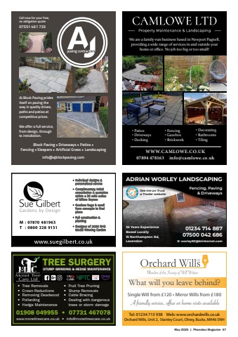 May 2025 | Phonebox Magazine 47TREE SURGERYSTUMP GRINDING & HEDGE MAINTENANCE01908 049955 %u2022 07731 467078www.monettreecare.co.uk %u2022 info@monettreecare.co.uk%u2022 Tree Removals%u2022 Crown Reductions%u2022 Removing Deadwood%u2022 Pollarding%u2022 Hedge Maintenance%u2022 Fruit Tree Pruning%u2022 Stump Removals%u2022 Cable Bracing%u2022 Dealing with dangeroustrees or storm damageWe are a family-run business based in Newport Pagnell, providing a wide range of services in and outside your home or office. No job too big or too small!%u2022 Patios%u2022 Driveways%u2022 Decking%u2022 Fencing%u2022 Gazebos%u2022 Brickwork%u2022 Decorating%u2022 Bathrooms%u2022 TilingWWW.CAMLOWE.CO.UK07894 478163 info@camlowe.co.ukBlock Paving %u2022 Driveways %u2022 Patios %u2022 Fencing %u2022 Sleepers %u2022 Artificial Grass %u2022 Landscapinginfo@ajblockpaving.comAJ Block Paving pridesitself on paving theway in quality drives,paths and patios atcompetitive prices.We offer a full service,from design, throughto installation.07551 461 733Call now for your free,no obligation quoteADRIAN WORLEY LANDSCAPINGFencing, Paving & Driveways 01234 714 887 07500 042 686E: worley60@btinternet.com 35 Years Experience Based Locally15 Northampton Rd, LavendonSee me on Trust a Trader websiteWhat will you leave behind? A friendly service, office or home visits availableTel: 01234 713 938 Web: www.orchardwills.co.ukOrchard Wills, Unit 2, Stanley Court, Olney, Bucks, MK46 5NHSingle Will from %u00a3120 %u2022 Mirror Wills from %u00a3180