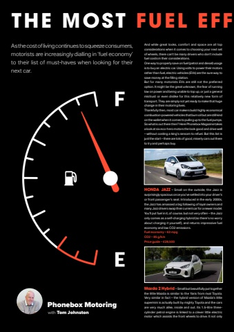 48 Phonebox Magazine | May 2025Phonebox Motoringwith Tom JohnstonAnd while great looks, comfort and space are all top considerations when it comes to choosing your next set of wheels, there can%u2019t be many drivers who don%u2019t include fuel costs in their considerations. One way to properly save on fuel (petrol and diesel) usage is to buy an electric car. Using volts to power their motors rather than fuel, electric vehicles (EVs) are the sure way to save money at the fi lling station.But for many motorists EVs are still not the preferred option. It might be the great unknown, the fear of running low on power and being unable to top up, or just a general mistrust or even dislike for this relatively new form of transport. They are simply not yet ready to make that huge change in their motoring lives. Thankfully then, most car makers build highly economical combustion-powered vehicles that burn oil but are still kind on the wallet when it comes to pulling up to the fuel pumps.So what is out there then? Here Phonebox Magazine takes a look at six eco-hero motors the look good and drive well %u2013 without costing a king%u2019s ransom to refuel. But this list is just the start %u2013 there are lots of good, miserly cars out there to try and perhaps buy.HONDA JAZZ %u2013 Small on the outside, the Jazz is surprisingly spacious once you%u2019ve settled into your driver%u2019s or front passenger%u2019s seat. Introduced in the early 2000s, the Jazz has amassed a big following of loyal owners and many Jazz drivers swap their current car for a newer model. You%u2019ll put fuel in it, of course, but not very often %u2013 the Jazz only comes as a self-charging hybrid (so there%u2019s no worry about charging it yourself), and returns impressive fuel economy and low CO2 emissions. Fuel economy %u2013 63 mpgCO2 %u2013 85 g/kmPrice guide %u2013 %u00a328,500Mazda 2 Hybrid %u2013 Small but beautifully put together the little Mazda is similar to the Yaris from rival Toyota. Very similar in fact %u2013 the hybrid version of Mazda%u2019s little supermini is actually built by mighty Toyota and the cars are very much alike, inside and out. Its 1.5-litre threecylinder petrol engine is linked to a clever little electric motor which assists the front wheels to drive. It not only THE MOST FUEL EFFAs the cost of living continues to squeeze consumers, motorists are increasingly dialling in %u2018fuel economy%u2019 to their list of must-haves when looking for their next car.