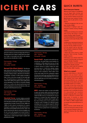 May 2025 | Phonebox Magazine 49QUICK BURSTS:Don%u2019t lose your licenceWearing some types of sunglasses can be illegal while driving and could land you with a fi ne or points on your licence. Experts at tyre fi rm BlackCircles have outlined 10 littleknown ways to get points on your licence:1 Wearing sunglasses that are too dark. Penalty: %u00a35000.2 Smoking or vaping in your car. Potential careless driving. Penalty: %u00a32500.3 Eating and drinking (non-alcohol) while driving. Not being in proper control. Penalty: %u00a3200 / 6 points. 4 Cluttered dashboard. A messy dash that obscures the view. Penalty: %u00a3100 / 3 points.5 Letting your dog hang its head out of the window. Animals should be secured. Penalty: %u00a35000 / 6 points.6 If you haven%u2019t had an eye test. Poor eyesight is dangerous. Penalty: %u00a31000 / 3 points.7 Road rage. Don%u2019t shout or make gestures while driving. Penalty: %u00a31000 / 3 points.8 Sleeping in your vehicle. Under the infl uence of alcohol with your keys in your car. Penalty: 10 points.9 Riding an electric scooter over the alcohol limit. Penalty: 6 points.10 If your child%u2019s seat isn%u2019t properly fi tted. Penalty: %u00a3500 / 3 points.What%u2019s in a name?Are you called Melvyn or Norman? Chances are you haven%u2019t made a claim on your car insurance for years. New research from cover experts MoneySuperMarket has revealed the names of the drivers who have the longest stretch of no-claims. The length of time that a driver has held an insurance policy and hasn%u2019t made a claim is one signal insurance providers use to calculate the price of a new premium. Car insurance providers typically off er a no-claims bonus or discount to drivers who have gone 12 months or more without making a claim. Names from the 1930s to 1960s suggest these are people with great experience on the road.Melvyn, Norman, Geoff , Neville and Leslie are among the names of men with most years between claims. For women it%u2019s Norma, Pat, Pam, Beryl and Jean.ICIENT CARSgives the small car a brisk and nippy take off from a standing start but it helps to keep petrol use down too. Power is harvested and sent to the battery every time you decelerate or brake. Fuel economy %u2013 74 mpgCO2 %u2013 90g/kmPrice guide %u2013 %u00a324,000Renault Clio E-Tech Hybrid%u2013 The Clio has been around for years and Renault has done a fi ne job of giving it a succession of facelifts and refreshes to keep it looking modern, attractive and, therefore, competitive. A potent 1.6-litre engine provides a lively 143 hp, more than enough for the small, light car. That performance is boosted by an electric motor which adds to the urgency when pulling away and accelerating. The E-Tech is a full self-charging hybrid so, as well as the decent performance and sharp handling that comes as standard on a Clio, you also get outstanding fuel economy.Fuel economy %u2013 67 mpgCO2 %u2013 96 g/kmPrice guide %u2013 %u00a320,000Vauxhall Corsa %u2013 Another highly successful name in the UK car world, Vauxhall%u2019s little Corsa goes back decades and although it is bigger and more well equipped than its older cousins from the 1980s and 1990s, it%u2019s still a decent consideration for anyone looking for a medium-size car with performance, a great drive and excellent fuel economy. There are petrol, hybrid and all-electric versions available, and all cars come well equipped and nicely fi nished. If you opt for a simple petrol car you can expect up to 128 hp from a turbocharged engine coupled with pleasing fuel usage. Fuel economy %u2013 60 mpgCO2 %u2013 120 g/kmPrice guide %u2013 %u00a318,500Suzuki Swifi %u2013 As good, rock-solid city runarounds go, the Swift takes some beating. It%u2019s a relatively no-frills experience but you do get a comfortable ride, ample performance and a decent amount of space inside the cabin and boot area. A 1.2-litre four-cylinder engine does the work, ably assisted by mild-hybrid electric motor assistance, which takes some of the strain away from the combustion engine thereby reducing the gas-guzzling. Build up some speed and carry it enthusiastically into a corner and the Swift lives up to its name, providing an entertaining drive.Fuel economy %u2013 61 mpgCO2 %u2013 105 g/kmPrice guide %u2013 %u00a319,500MG3 %u2013 Smart and modern to look at the MG3 is quick and sporty while returning strong fuel economy fi gures. It%u2019s priced attractively too, which makes the MG a serious consideration for anyone looking for a modern fi ve-door hatchback. The car%u2019s 1.5-litre four-cylinder petrol engine gets, like most of these sorts of cars, assistance from an electric motor. The MG%u2019s is an effi cient system and allows you run on electric power for decent periods of time. Inside feels no-nonsense but wellmade and it has a quality fi nish. It%u2019s a satisfying car to drive too.Fuel economy %u2013 60 mpgCO2 %u2013 136 g/kmPrice guide %u2013 %u00a317,000Renault Clio ^Vauxhall Corsa ^Suzuki Swifi ^MG3 ^