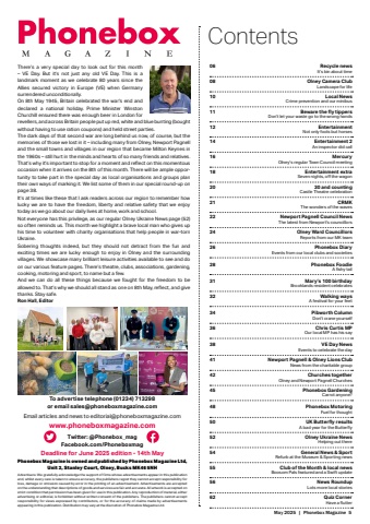 May 2025 | Phonebox Magazine 5ContentsPhonebox Magazine is owned and published by Phonebox Magazine Ltd, Unit 2, Stanley Court, Olney, Bucks MK46 5NHAdvertisers: We gratefully acknowledge the support of firms whose advertisements appear in this publication and, whilst every care is taken to ensure accuracy, the publishers regret they cannot accept responsibility for loss, damage or omission caused by error in the printing of an advertisement. Advertisements are accepted on the understanding that descriptions of goods and services are fair and accurate. All artwork is accepted on strict condition that permission has been given for use in this publication. Any reproduction of material, either advertising or editorial, is forbidden without written consent of the publishers. The publishers cannot accept responsibility for views expressed by contributors, or for the accuracy of claims made by advertisements appearing in this publication. Distribution may vary at the discretion of Phonebox Magazine Ltd.To advertise telephone (01234) 713298or email sales@phoneboxmagazine.comEmail articles and news to editorial@phoneboxmagazine.comwww.phoneboxmagazine.comTwitter: @Phonebox_magFacebook.com/PhoneboxmagDeadline for June 2025 edition - 14th May06 Recycle news It%u2019s bin about time08 Olney Camera Club Landscape for life 10 Local NewsCrime prevention and our minibus 11 Beware the fl y tippersDon%u2019t let your waste go to the wrong hands 12 Entertainment Not only fools but horses 14 Entertainment 2An inspector did call 16 Mercury Olney%u2019s regular Town Council meeting 18 Entertainment extra Seven nights, off the wagon 20 30 and counting Castle Theatre celebration 21 CRMK The wonders of the waves 22 Newport Pagnell Council NewsThe latest from Newport%u2019s councillors 24 Olney Ward CouncillorsReports from our MK team 26 Phonebox Diary Events from our local clubs and societies28 Phonebox Foodie A fi shy tail 31 Mary%u2019s 100 birthday Brooklands resident celebrates 32 Walking ways A festival for your feet 34 Pibworth ColumnDon%u2019t crane yourself36 Chris Curtis MP Our local MP has his say38 VE Day News Events to celebrate the day 41 Newport Pagnell & Olney Lions ClubNews from the charitable group42 Churches together Olney and Newport Pagnell Churches 45 Phonebox Gardening Carrot anyone? 48 Phonebox MotoringFuel for thought50 UK Butterfl y results A bad year for the Butterfl y 52 Olney Ukraine News Helping out there54 General News & SportRefurb at the Museum & Sporting news 55 Club of the Month & local news Boosom Pals featured and a Swift update56 News Roundup Lots more local stories 62 Quiz Corner Have a fl utterThere%u2019s a very special day to look out for this month %u2013 VE Day. But it%u2019s not just any old VE Day. This is a landmark moment as we celebrate 80 years since the Allies secured victory in Europe (VE) when Germany surrendered unconditionally.On 8th May 1945, Britain celebrated the war%u2019s end and declared a national holiday. Prime Minister Winston Churchill ensured there was enough beer in London for revellers, and across Britain people put up red, white and blue bunting (bought without having to use ration coupons) and held street parties. The dark days of that second war are long behind us now, of course, but the memories of those we lost in it %u2013 including many from Olney, Newport Pagnell and the small towns and villages in our region that became Milton Keynes in the 1960s %u2013 still hurt in the minds and hearts of so many friends and relatives.That%u2019s why it%u2019s important to stop for a moment and refl ect on this momentous occasion when it arrives on the 8th of this month. There will be ample opportunity to take part in the special day as local organisations and groups plan their own ways of marking it. We list some of them in our special round-up on page 38.It%u2019s at times like these that I ask readers across our region to remember how lucky we are to have the freedom, liberty and relative safety that we enjoy today as we go about our daily lives at home, work and school.Not everyone has this privilege, as our regular Olney Ukraine News page (52) so often reminds us. This month we highlight a brave local man who gives up his time to volunteer with charity organisations that help people in war-torn Ukraine. Sobering thoughts indeed, but they should not detract from the fun and exciting times we are lucky enough to enjoy in Olney and the surrounding villages. We showcase many brilliant leisure activities available to see and do on our various feature pages. There%u2019s theatre, clubs, associations, gardening, cooking, motoring and sport, to name but a few.And we can do all these things because we fought for the freedom to be allowed to. That%u2019s why we should all stand as one on 8th May, refl ect, and give thanks. Stay safe.Ron Hall, Editor