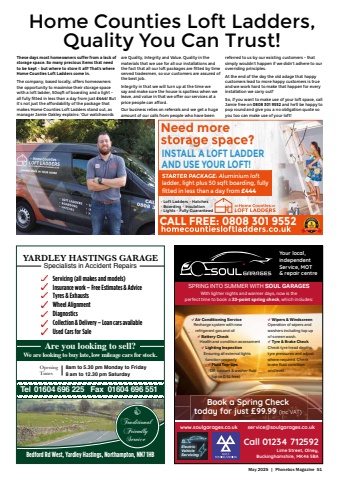 May 2025 | Phonebox Magazine 51YARDLEY HASTINGS GARAGESpecialists in Accident RepairsServicing (all makes and models)Insurance work %u2013 Free Estimates & AdviceTyres & ExhaustsWheel Alignment DiagnosticsCollection & Delivery %u2013 Loan cars availableUsed Cars for SaleAre you looking to sell? We are looking to buy late, low mileage cars for stock.8am to 5.30 pm Monday to Friday8 am to 12.30 pm SaturdayOpeningTimesTel 01604 696 225 Fax 01604 696 551Bedford Rd West, Yardley Hastings, Northampton, NN7 1HBTraditionalFriendly Service CYour local, independent Service, MOT & repair centreElectricVehicle Servicingwww.soulgarages.co.uk service@soulgarages.co.ukCall 01234 712592Lime Street, Olney, Buckinghamshire, MK46 5BA%u2714 Air Conditioning ServiceRecharge system with new refrigerant gas and oil%u2714 Battery Check Health and condition assessment%u2714 Lighting Inspection Ensuring all external lights function properly%u2714 Fluid Top-Ups Oil, coolant & washer fl uid (up to 0.5L free)SPRING INTO SUMMER WITH SOUL GARAGESWith lighter nights and warmer days, now is the perfect time to book a 33-point spring check, which includes:%u2714 Wipers & WindscreenOperation of wipers and washers including top up of screen wash.%u2714 Tyre & Brake Check Check tyre tread depths, tyre pressures and adjust where required. Check brake fl uid condition and level.Book a Spring Check today for just %u00a399.99 (inc VAT)%u2022 Loft Ladders %u2022 Hatches %u2022 Boarding %u2022 Insulation %u2022 Lights %u2022 Fully GuaranteedSTARTER PACKAGE: Aluminium loft ladder, light plus 50 sqft boarding, fully fitted in less than a day from %u00a3355Need more storage space?STARTER PACKAGE Aluminium loft INSTALL A LOFT LADDER AND USE YOUR LOFT!CALL FREE: 0808 301 9552These days most homeowners suffer from a lack of storage space. So many precious items that need to be kept %u2013 but where to store it all? That%u2019s where Home Counties Loft Ladders come in. The company, based locally, offers homeowners the opportunity to maximise their storage space with a loft ladder, 50sqft of boarding and a light - all fully fitted in less than a day from just %u00a3444! But it%u2019s not just the affordability of the package that makes Home Counties Loft Ladders stand out, as manager Jamie Oakley explains: %u2018Our watchwords are Quality, Integrity and Value. Quality in the materials that we use for all our installations and the fact that all our loft packages are fitted by time served tradesmen, so our customers are assured of the best job. Integrity in that we will turn up at the time we say and make sure the house is spotless when we leave, and value in that we offer our services at a price people can afford. Our business relies on referrals and we get a huge amount of our calls from people who have been referred to us by our existing customers - that simply wouldn%u2019t happen if we didn%u2019t adhere to our overriding principles. At the end of the day the old adage that happy customers lead to more happy customers is true and we work hard to make that happen for every installation we carry out!%u2019 So, if you want to make use of your loft space, call Jamie free on 0808 301 9552 and he%u2019ll be happy to pop round and give you a no obligation quote so you too can make use of your loft!Home Counties Loft Ladders, Quality You Can Trust!%u00a3444