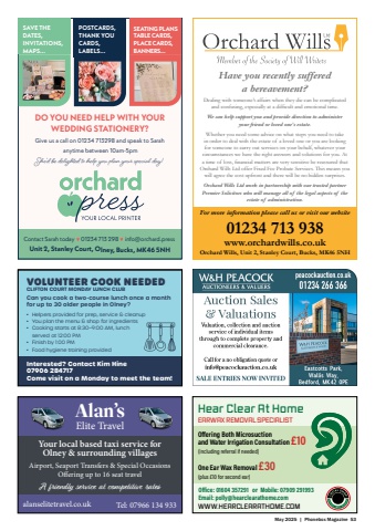 May 2025 | Phonebox Magazine 53WWW.HEARCLEARATHOME.COMOffice: 01604 357291 or Mobile: 07909 291993Email: polly@hearclearathome.comHear Clear At HomeEARWAX REMOVAL SPECIALISTOffering Both Microsuction and Water Irrigation Consultation %u00a310(including referral if needed)One Ear Wax Removal %u00a330(plus %u00a310 for second ear)Have you recently suffered a bereavement?Dealing with someone%u2019s affairs when they die can be complicated and confusing, especially at a difficult and emotional time. We can help support you and provide direction to administer your friend or loved one%u2019s estate.Whether you need some advice on what steps you need to take in order to deal with the estate of a loved one or you are looking for someone to carry out services on your behalf, whatever your circumstances we have the right answers and solutions for you. At a time of loss, financial matters are very sensitive be reassured that Orchard Wills Ltd offer Fixed Fee Probate Services. This means you will agree the cost upfront and there will be no hidden surprises.Orchard Wills Ltd work in partnership with our trusted partner Premier Solicitors who will manage all of the legal aspects of the estate of administration.For more information please call us or visit our website01234 713 938www.orchardwills.co.ukOrchard Wills, Unit 2, Stanley Court, Bucks, MK46 5NHSEATING PLANS TABLE CARDS, PLACE CARDS,BANNERS...SAVE THE DATES, INVITATIONS, MAPS...POSTCARDS, THANK YOU CARDS, LABELS...Contact Sarah today 01234 713 298 info@orchard.pressUnit 2, Stanley Court, Olney, Bucks, MK46 5NH DO YOU NEED HELP WITH YOUR WEDDING STATIONERY?Give us a call on 01234 713298 and speak to Sarah anytime between 10am-5pmShe%u2019d be delighted to help you plan your special day!Tel: 07966 134 933Elite TravelAlan%u2019s Offering up to 16 seat travelalanselitetravel.co.ukA friendly service at competitive ratesAirport, Seaport Transfers & Special OccasionsYour local based taxi service for Olney & surrounding villagesCan you cook a two-course lunch once a month for up to 30 older people in Olney?VOLUNTEER COOK NEEDEDInterested? Contact Kim Hine07906 284717Come visit on a Monday to meet the team!%u2022 Helpers provided for prep, service & cleanup%u2022 You plan the menu & shop for ingredients%u2022 Cooking starts at 8:30%u20139:00 AM, lunch served at 12:00 PM%u2022 Finish by 1:00 PM%u2022 Food hygiene training providedCLIFTON COURT MONDAY LUNCH CLUB