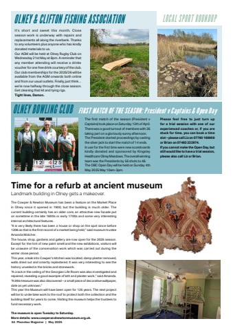 54 Phonebox Magazine | May 2025OLNEY & CLIFTON FISHING ASSOCIATIONIt%u2019s short and sweet this month. Close season work is underway with repairs and replacements all along the riverbank. Thanks to any volunteers plus anyone who has kindly donated materials to us. Our AGM will be held at Olney Rugby Club on Wednesday 21st May at 8pm. A reminder that any member attending will receive a drinks voucher for one free drink courtesy of the club. Our club memberships for the 2025/26 will be available from the AGM onwards both online and from our usual outlets. Finally, just think%u2026 we%u2019re now halfway through the close season. Get cleaning that kit and tying rigs. Tight lines, Damon.LOCAL SPORT ROUNDUPOLNEY BOWLING CLUB FIRST MATCH OF THE SEASON: President v Captains & Open DayThe first match of the season (President v Captains) took place on Saturday 12th of April.There was a good turnout of members with 26 taking part on a gloriously sunny afternoon. The President started proceedings by casting the silver jack to start the match of 14 ends.In use for the fi rst time were new scoreboards kindly donated and sponsored by Kingsley Healthcare Olney Meadows. The overall winning team was the Presidents by 56 shots to 48.The OBC Open Day will be held on Sunday 4th May 2025 May 10am-3pm. Please feel free to just turn up for a trial session with one of our experienced coaches or, if you are stuck for time, you can book a time slot %u2013 please call Liz on 07790 169906 or Brian on 07483 222974. If you cannot make the Open Day, but still would like to have a trial session, please also call Liz or Brian.Time for a refurb at ancient museumLandmark building in Olney gets a makeover.The Cowper & Newton Museum has been a feature on the Market Place in Olney since it opened in 1900, but the building is much older. The current building certainly has an older core, an attractive new facade put on sometime in the late 1600s or early 1700s and some very interesting internal architectural features. %u201cIt is very likely there has been a house or shop on the spot since before 1206 as that is the fi rst record of a market being held,%u201d said museum trustee Amanda Molcher.The house, shop, gardens and gallery are now open for the 2025 season. Except for the hint of new paint smell and the new exhibitions, visitors will be unaware of the conservation work which was carried out during the winter close period. This year, a leak into Cowper%u2019s kitchen was located, damp plaster removed, walls dried out and smartly replastered. It was very interesting to see the history unveiled in the bricks and stonework. %u201cA crack in the ceiling of the Georgian Life Room was also investigated and repaired, revealing a good example of lath and plaster work,%u201d said Amanda. %u201cA little treasure was also discovered %u2013 a small piece of decorative wallpaper, date as yet unknown.%u201dThis year the Museum will have been open for 125 years. The next project will be to undertake work to the roof to protect both the collection and the building itself for years to come. Visiting the museum helps the trustees to fund necessary work.The museum is open Tuesday to Saturday. More details: www.cowperandnewtonmuseum.org.uk.