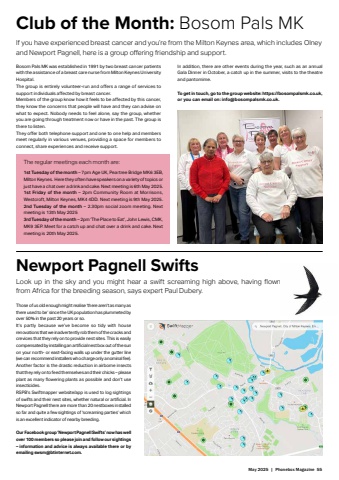 May 2025 | Phonebox Magazine 55Club of the Month: Bosom Pals MKIf you have experienced breast cancer and you%u2019re from the Milton Keynes area, which includes Olney and Newport Pagnell, here is a group off ering friendship and support.Bosom Pals MK was established in 1991 by two breast cancer patients with the assistance of a breast care nurse from Milton Keynes University Hospital.The group is entirely volunteer-run and off ers a range of services to support individuals aff ected by breast cancer.Members of the group know how it feels to be aff ected by this cancer, they know the concerns that people will have and they can advise on what to expect. Nobody needs to feel alone, say the group, whether you are going through treatment now or have in the past. The group is there to listen.They off er both telephone support and one to one help and members meet regularly in various venues, providing a space for members to connect, share experiences and receive support.In addition, there are other events during the year, such as an annual Gala Dinner in October, a catch up in the summer, visits to the theatre and pantomime.To get in touch, go to the group website: https://bosompalsmk.co.uk, or you can email on: info@bosompalsmk.co.uk.Newport Pagnell SwiftsLook up in the sky and you might hear a swift screaming high above, having fl own from Africa for the breeding season, says expert Paul Dubery.Those of us old enough might realise %u2018there aren%u2019t as many as there used to be%u2019 since the UK population has plummeted by over 50% in the past 20 years or so. It%u2019s partly because we%u2019ve become so tidy with house renovations that we inadvertently rob them of the cracks and crevices that they rely on to provide nest sites. This is easily compensated by installing an artifi cial nest box out of the sun on your north- or east-facing walls up under the gutter line (we can recommend installers who charge only a nominal fee). Another factor is the drastic reduction in airborne insects that they rely on to feed themselves and their chicks %u2013 please plant as many fl owering plants as possible and don%u2019t use insecticides.RSPB%u2019s Swiftmapper website/app is used to log sightings of swifts and their nest sites, whether natural or artifi cial. In Newport Pagnell there are more than 20 nestboxes installed so far and quite a few sightings of %u2018screaming parties%u2019 which is an excellent indicator of nearby breeding. Our Facebook group %u2018Newport Pagnell Swifts%u2019 now has well over 100 members so please join and follow our sightings %u2013 information and advice is always available there or by emailing swsm@btinternet.com.The regular meetings each month are:1st Tuesday of the month %u2013 7pm Age UK, Peartree Bridge MK6 3EB, Milton Keynes. Here they often have speakers on a variety of topics or just have a chat over a drink and cake. Next meeting is 6th May 2025.1st Friday of the month %u2013 2pm Community Room at Morrisons, Westcroft, Milton Keynes, MK4 4DD. Next meeting is 9th May 2025.2nd Tuesday of the month %u2013 2.30pm social zoom meeting. Next meeting is 13th May 20253rd Tuesday of the month %u2013 2pm %u2018The Place to Eat%u2019, John Lewis, CMK, MK9 3EP. Meet for a catch up and chat over a drink and cake. Next meeting is 20th May 2025.