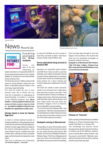 56 Phonebox Magazine | May 2025F u n d i n g a v a i l a b l e fo r O l n ey studentsU n d e r t h e age of 25 and embarking on higher education or an apprenticeship? Or do you know someone who is? You could be eligible for funding from the Olney British School Charity Fund.The Trust was set up in 1962 to award small grants to young people in Olney who are either in education beyond A-level, or are entering an apprenticeship. You must be under 25, you or your parents must live in Olney and you must be in education or undergoing an apprenticeship, at present or starting in the 2025/26 academic year. More details: www.youngfuturesfund.org/olney-british-school -charity-fund or: youngfutures@heartofbucks.org. Deadline for applications is 30th June.Chicks hatch in time for Easter Egg Hunt A clutch of chicks hatched recently at Kingsley Healthcare%u2019s Olney Meadows just in time for the care home%u2019s Easter Egg hunt. Children hunted eggs hidden throughout the home%u2019s landscaped gardens, using clues written in prose. Families were also excited when visiting the living incubated eggs and hatching chicks taking their early steps. %u201cWe love to welcome our community From his early days through to the Last Supper and Crucifi xion, this musical will show you his wonderful messages of kindness, tolerance and love. Godspell is at Sharnbrook Mill Theatre, 13th-17th May, 7.30pm. Tickets from %u00a320: www.sharnbrookmilltheatre.co.uk or from Pick-A-Lily fl orists. Cheese on %u2018Towcest%u2019 April%u2019s meeting of Olney WI welcomed Mark Rodgers, an artisan cheesemonger from nearby Towcester, for a %u2018cheesy chat%u2019.%u201cHis knowledge and passion shone through and we all learnt about the history of cheese and all the diff erent varieties, some of which Mark makes himself,%u201d said the group%u2019s Janet Smith. %u201cMembers were able to purchase at the end of the meeting, and the queue kept growing!%u201dto enjoy the facilities we are so lucky to have here, and want to share,%u201d said Caryn Cooper, Family Liaison Offi cer said: Force specialists hang around at Stadium MKMembers of a specialist police division used MK Dons%u2019 famous walls to practice abseiling, rope safety and people removal recently. Thames Valley Police%u2019s crack Rope Access Team chose the football ground%u2019s shiny exterior for a day%u2019s training and incident rehearsal in readiness for real-life events.The team are called in when someone needs to be removed from a high place after they have %u2018chosen to be there%u2019. That includes protestors sitting in buildings, on bridges and in trees. They have previously dealt with HS2 rail link demonstrators and were called earlier this year when war protestors staged a sit-in on Oxford%u2019s famous Radcliff e Camera building.%u201cIt%u2019s our fi rst time here at Stadium MK,%u201d said a spokesman. %u201cWe have training facilities at our headquarters in Upper Heyford, but you can get used to the same scenario, so we try to fi nd other places to practice.%u201dGodspell coming to SharnbrookThe parables of Jesus Christ will be told in new, exciting ways in this visionary musical by the award-winning Sharnbrook Mill Theatre. From the pen of Stephen Schwartz (Wicked, Pippin, The Prince of Egypt) we will open your eyes to the teachings of Jesus with fabulous songs and clever storytelling. News Round Up Chicks hatched just in time Games World