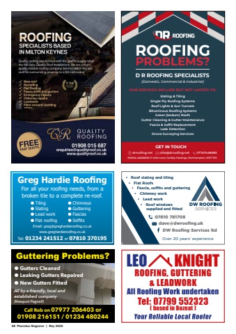 58 Phonebox Magazine | May 2025DW ROOFINGSERVICESDW Roofing Final.pdf 1 08/09/2020 17:10%u2022 Roof slating and tiling%u2022 Flat Roofs%u2022 Fascia, soffits and guttering%u2022 Chimney work%u2022 Lead work%u2022 Roof windows supplied and fittedOver 20 years%u2019 experience07810 781708dave@dwroofing.ukDW Roofing Services ltdROOFING, GUTTERING & LEADWORKAll Roofing Work undertaken Tel: 07799 552323( based in Bozeat ) LEO KNIGHT Guttering Problems?Call Rob on 07977 206403 or01908 216151 / 01234 480244%u25cf Gutters Cleaned%u25cf Leaking Gutters Repaired%u25cf New Gutters FittedAll by a friendly, local and established company(Newport Pagnell)Greg Hardie RoofingFor all your roofing needs, from abroken tile to a complete re-roof.%u25cf Tiling%u25cf Slating%u25cf Lead work%u25cf Flat roofing%u25cf Chimneys%u25cf Guttering%u25cf Fascias%u25cf SoffitsEmail: greg@greghardieroofing.co.ukwww.greghardieroofing.co.ukTel: 01234 241512 or 07810 370195ROOFINGPROBLEMS?D R ROOFING SPECIALISTSOUR SERVICES INCLUDE BUT NOT LIMITED TO:(Domestic, Commercial & Industrial)Slating & TilingSingle Ply Roofing SystemsRoof Lights & Sun TunnelsBituminous Roofing SystemsGreen (Sedum) RoofsGutter Cleaning & Gutter MaintenanceFascia & Soffit ReplacementLeak DetectionDrone Surveying ServicesGET IN TOUCHdrroofing.net ollie@drroofing.net 07747448683POSTAL ADDRESS: 9 Little Lane, Yardley Hastings, Northampton, NN7 1EN