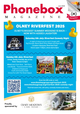 June 2025 | Phonebox Magazine 130YEARSLatest Local News Events & BusinessJune 202530YEARSLatest Local News Events & BusinessJune 2025OLNEY RIVERFEST 2025OLNEY%u2019S BIGGEST SUMMER WEEKEND IS BACK %ufffd NOW WITH ADDED LAUGHTER!Saturday 5th July: Riverfest Comedy NightTickets from %u00a310 book onlineSunday 6th July: RiverfestA free, family-friendly day of fun from 12noon to 6pmWhat%u2019s on: Duck Race %u2022 Raft Race %u2022%u2022 Live Bands %u2022 Food and Drink Stalls %u2022%u2022 Children%u2019s Fairground %u2022%u2022 Craft and Charity Stalls %u2022%u2022 Circus Fun with The Great Gappo %u2022Proudly sponsored byOLNEY%u2019S BIGGEST SUMMER WEEKEND IS BACK %ufffd Saturday 5th July: Riverfest Comedy NightA night of stand-up you won%u2019t forget with Raj Pooraja, Steve Ward, Elroy Walsh and Ryan MoldLocation: Marquee, Riverfest FieldDoors open 7:30pm, show starts 8pmScan the QR code or visit: www.theolneygroup.org/riverfest-2025www.theolneygroup.org/riverfest-2025-comedy-nightFind full event info, raft entry, comedy tickets and more...