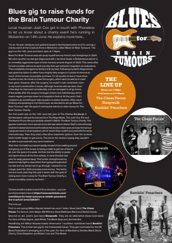 June 2025 | Phonebox Magazine 11Blues gig to raise funds for the Brain Tumour Charity Local musician Josh Cox got in touch with Phonebox to let us know about a charity event he%u2019s running in Wolverton on 14th June. He explains more here...%u201cI%u2019m an 18-year-old blues rock guitarist based in Northamptonshire and I%u2019m running a charity event at the Craufurd Arms in Wolverton called %u2018Blues for Brain Tumours%u2019. The gig is on the 14th June and doors open at 7.30pm. Blues For Brain Tumours was set up by myself and my friend Louis Humphreys in 2024. We set it up after my dad got diagnosed with a terminal Grade 4 Glioblastoma (which is an incredibly aggressive type of brain tumour) around August of 2023. This came after he had a sudden seizure at work one day, then got rushed to hospital in an ambulance. This completely changed my family%u2019s and my lives. Following my dad%u2019s diagnosis he was given the option to either have a highly risky surgery in London to remove as much of the tumour as possible and have 12-18 months to live or have three months to live. He chose to have the surgery, which went as well as it could have gone. However, after the surgery, he couldn%u2019t even remember mine or my mum%u2019s and brother%u2019s names, although he knew who we were. Over a few days he improved considerably, and we managed to all go home. A few weeks after the surgery he began chemo and radiotherapy, which meant regular journeys down to a hospital in Oxford. At this point I felt I needed to do something to help people in a similar situation. After much thinking and speaking to my friend Louis, we decided to set up %u2018Blues For Brain Tumours%u2019 with the goal of running live events to raise money for The Brain Tumour Charity. Our fi rst event was on the 14th June last year at The Charles Bradlaugh in Northampton, with performances from The Mojo Mules, The Josh Cox Trio and The Atomic Prune. We successfully raised %u00a31,000 for The Brain Tumour Charity. This gig was made even more special as my dad was able to attend. Dad%u2019s chemotherapy treatment lasted several months before the doctors did a scan and saw the tumour had grown back in several places, which meant they couldn%u2019t proceed with the same chemotherapy. Then they tried a few other treatment options. Over the summer, Dad%u2019s health began to get worse. This led to the doctors saying they wouldn%u2019t be able to proceed with any more treatment. After that, his health worsened rapidly. He went from walking around and going out of the house, to being unable to get out of bed at all, over the space of a week. He then lost the ability to speak and spent almost all his time asleep. In early October last year he sadly passed away. This further strengthened my desire to help fi ght to stop others from going through what my dad and my family had to go through. I wanted to run a larger event for 2025 and raise more money. This led to me and Louis planning this year%u2019s event with the goal of raising even more money for The Brain Tumour Charity, a cause incredibly close to my heart. %u201cTickets are %u00a38 in advance and %u00a310 on the door - you can purchase tickets here at https://www.seetickets.com/event/blues-for-brain-tumours-w-ramblin-preachers/the-craufurd-arms/3283371The Line up:First on are young Milton Keynes based neo-soul / indie / blues band The Chess Pieces. For fans of John Mayer, Bill Withers, Dave Matthews Band and Daniel Caesar.Second on are Josh%u2019s own band Sleepwalk. They are an alternative blues-rock band. For fans of Philip Sayce, Jack White, The Black Keys and Jimi Hendrix. Headlining are Milton Keynes-based Americana / southern rock/blues band Ramblin%u2019 Preachers. This is their last gig for the foreseeable future. They got nominated for the UK Blues Federation%u2019s emerging act of the year. For fans of Blackberry Smoke, Black Stone Cherry, Chris Stapleton and Robert Jon and The Wreck.THE LINE UP(Doors are 7:30pmFirst band on at 7:45pm)The Chess PiecesSleepwalkRamblin%u2019 PreachersThe Chess PiecesSleepwalkRamblin%u2019 Preacherspicture credit Firebird.photo