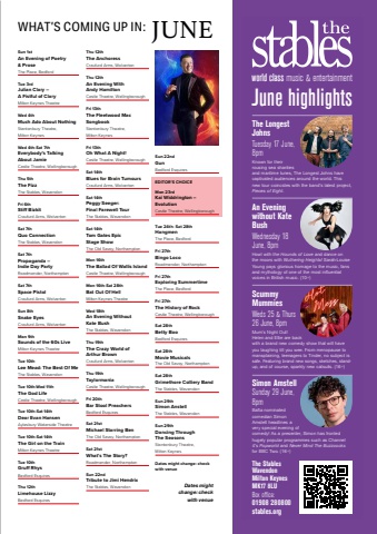 June 2025 | Phonebox Magazine 13Dates might change: check with venueWHAT%u2019S COMING UP IN: JUNESun 1stAn Evening of Poetry & ProseThe Place, BedfordTue 3rdJulian Clary %u2013 A Fistful of ClaryMilton Keynes TheatreWed 4thMuch Ado About NothingStantonbury Theatre, Milton KeynesWed 4th-Sat 7th Everybody%u2019s Talking About JamieCastle Theatre, WellingboroughThu 5thThe FizzThe Stables, WavendonFri 6thStifi BizkitCraufurd Arms, WolvertonSat 7thQuo ConnectionThe Stables, WavendonSat 7thPropaganda %u2013 Indie Day PartyRoadmender, NorthamptonSat 7thSpace PistolCraufurd Arms, WolvertonSun 8thSnake EyesCraufurd Arms, WolvertonMon 9thSounds of the 60s LiveMilton Keynes TheatreTue 10thLee Mead: The Best Of MeThe Stables, WavendonTue 10th-Wed 11thThe God LifeCastle Theatre, WellingboroughTue 10th-Sat 14thDear Evan HansenAylesbury Waterside TheatreTue 10th-Sat 14thThe Girl on the TrainMilton Keynes TheatreTue 10thGrufi RhysBedford EsquiresThu 12thLimehouse LizzyBedford EsquiresThu 12thThe AnchoressCraufurd Arms, WolvertonThu 12thAn Evening With Andy HamiltonCastle Theatre, WellingboroughFri 13thThe Fleetwood Mac SongbookStantonbury Theatre, Milton KeynesFri 13thOh What A Night!Castle Theatre, WellingboroughSat 14thBlues for Brain TumoursCraufurd Arms, WolvertonSat 14thPeggy Seeger: Final Farewell TourThe Stables, WavendonSat 14thTom Gates Epic Stage ShowThe Old Savoy, NorthamptonMon 16thThe Ballad Of Wallis IslandCastle Theatre, WellingboroughMon 16th-Sat 28thBat Out Of HellMilton Keynes TheatreWed 18thAn Evening Without Kate BushThe Stables, WavendonThu 19thThe Crazy World of Arthur BrownCraufurd Arms, WolvertonThu 19thTaylormaniaCastle Theatre, WellingboroughFri 20thBar Stool PreachersBedford EsquiresSat 21stMichael Starring BenThe Old Savoy, NorthamptonSat 21stWhat%u2019s The Story?Roadmender, NorthamptonSun 22ndTribute to Jimi HendrixThe Stables, WavendonSun 22ndGunBedford EsquiresEDITOR%u2019S CHOICEMon 23rdKai Widdrington %u2013 EvolutionCastle Theatre, WellingboroughTue 24th- Sat 28thHangmenThe Place, BedfordFri 27thBingo LocoRoadmender, NorthamptonFri 27thExploring SummertimeThe Place, BedfordFri 27thThe History of RockCastle Theatre, WellingboroughSat 28thBetty BooBedford EsquiresSat 28thMovie MusicalsThe Old Savoy, NorthamptonSat 28thGrimethore Colliery BandThe Stables, WavendonSun 29thSimon AnstellThe Stables, WavendonSun 29thDancing Through The SeasonsStantonbury Theatre, Milton KeynesDates might change: check with venueThe StablesWavendonMilton KeynesMK17 8LU Box office: 01908 280800stables.orgworld class music & entertainmentJune highlightsThe Longest JohnsTuesday 17 June, 8pmKnown for their rousing sea shanties and maritime tunes, The Longest Johns have captivated audiences around the world. This new tour coincides with the band%u2019s latest project, Pieces of Eight.An Evening without Kate Bush Wednesday 18 June, 8pmHowl with the Hounds of Love and dance on the moors with Wuthering Heights! Sarah-Louise Young pays glorious homage to the music, fans and mythology of one of the most influential voices in British music. (10+)Scummy MummiesWeds 25 & Thurs 26 June, 8pmMum%u2019s Night Out! Helen and Ellie are back with a brand new comedy show that will have you laughing till you wee. From menopause to mansplaining, teenagers to Tinder, no subject issafe. Featuring brand new songs, sketches, standup, and of course, sparkly new catsuits. (16+)Simon AmstellSunday 29 June, 8pmBafta nominated comedian Simon Amstell headlines a very special evening of comedy! As a presenter, Simon has fronted hugely popular programmes such as Channel 4%u2019s Popworld and Never Mind The Buzzcocksfor BBC Two. (16+)