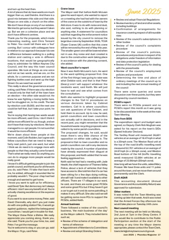June 2025 | Phonebox Magazine 17June 2025 and turn up the heat then.A lot of places that do have wards are much bigger than us, said Deirdre. And there is a good mix between this side and that side. Shops on one side, a church on the other. We don%u2019t have shops on any of our estates. We tried to get some, but they weren%u2019t taken up. But we are a cohesive place and we don%u2019t have diff erent centres.Thank you for the proposals, which made interesting reading, said Chris Tennant to Peter. You could tell there was a %u2018but%u2019 coming. But I concur with colleagues here in relation to our approach because I do see a diff erence between walking to a polling station and casting a vote in different locations, that would be geographically easy to administer for Milton Keynes City Council, and the way this town council operates. We look at things as one voice and not as two wards, and we are, on the whole, for a common purpose and are not fi ghting battles east and west up the High Street. Do we need two wards? This really is about the governance around voting, said Peter. If there was a by-election it would only be that half of the town have an election %u2013 the other side would not. He knew he was fi ghting a losing battle here, but he struggled on, to his credit. The last by-election cost %u00a39,000, and the next one could be half that, but I take your point, he said. You%u2019re saying that having two wards would be more effi cient, said Chris. I don%u2019t think it will be more effi cient for us, though, and we don%u2019t have that many by-elections. We have managed to co-opt people. I%u2019m not sure that it would be more effi cient.We%u2019re down about three people at the moment, said Colin Rodden, but I agree with fellow councillors that we need to keep a fairly neat patch, just one ward, but what I think we do need is to engage more with people so that they actually come forward. That%u2019s what we really need. So anything you can do to engage more people would be really good. I know it%u2019s diffi cult getting people to join the parish council, and thank you for all the work you do, said Peter. I%u2019ll take that back with me, he added, although it sounded like he probably wouldn%u2019t. The poor chap had had enough and wanted to get home.I know you want to split us for effi ciency, said David Tyler. But democracy isn%u2019t always effi cient. I don%u2019t see any benefi t at all. You%u2019re actually chasing excellence at the expense of good.If you want to save some money, Peter, said David Chennells, why don%u2019t you just make do with one polling station? No, it would go against guidance, replied the beleaguered councilman. I would get in trouble for that. The Mayor threw Peter a lifeline. We really appreciate you coming along, thank you, she said. Thank you for your time, too, said Peter. I%u2019ve got the message. You%u2019re welcome to stay, or you can go, said the Mayor. I%u2019ll go, said Peter.Crane issueThe Mayor said that before Keith McLean gave his ward report, she wanted to report on a meeting she had had with the owners of the crane on the outskirts of town by the Aldi store. It was to do with noise and dust, she said, nothing to do with planning or anything else. A statement for councillors said that regarding the enforcement notice issued by the city council to remove the large blue crane by September 2025, TCUK (Tower Cranes UK) confi rm that this crane will be removed by the end of May this year.The smaller green one will be lowered when not in use. Any noise and dust created is due to the construction work taking place in accordance with the planning consent, she added.%u00a0Ward councillor%u2019s reportNow it was Keith McLean%u2019s turn. He went to the ward splitting proposal first. One of the first things I was going to raise was what Debbie said, and that is that Peter (Geary) and I will support whatever the residents want, said Keith. We will just have to wait and see what comes from the consultation.%u00a0Keith also wanted to highlight proposed changes to the %u2018Call In%u2019 procedures on various decisions taken by Cabinet members. Call In is where councillors can ask questions of the Cabinet, and hold them to account. Up to now, he said, parish councillors and town councillors can actually call in decisions, and in the recent past, you might remember that the household waste recycling proposals were called in by some parish councillors. The proposed changes, he said, would mean there%u2019s very little chance of the opposition on either side calling in. The proposal is that no town councillor and no parish councillors can call in any decisions made by the council. A number of parishes have already expressed their disgust at this proposal, and Keith added that he was feeling aggrieved too.Keith said he had had a meeting with Jade Hewitt, the chief inspector of Thames Valley Police, about a lack of vehicles that they have access to. She told him that if a car has been sitting for a few days doing nothing, she will %u2018nab%u2019 it and make it available to other offi cers. There are 17 villages in our ward, he said, and there are some great PCSOs and some great PCs but if they haven%u2019t got a car to get out in and do some patrolling, it makes it very diffi cult. She also said we will be getting some more PCs to support the PCSOs, added Keith.Annual businessThere followed a review of the council%u2019s business, %u2018the main business of the day%u2019 as the Mayor called it. They included items such as;%u25b6 Review of the scheme of delegation and terms of reference%u25b6 Appointment of Members to Committees%u25b6 Review and adopt Standing Orders%u25b6 Review and adopt Financial Regulations%u25b6 Review inventory of land and other assets, including buildings%u25b6 Confirmation of arrangements for insurance covering respect of all insurable risks%u25b6 Review of the council%u2019s subscriptions to other bodies%u25b6 Review of the co