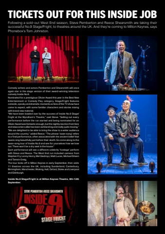 18 Phonebox Magazine | June 2025Following a sold-out West End season, Steve Pemberton and Reece Shearsmith are taking their successful No.9 Stage/Fright, to theatres around the UK. And they%u2019re coming to Milton Keynes, says Phonebox%u2019s Tom Johnston.Comedy writers and actors Pemberton and Shearsmith will once again star in the stage version of their award-winning television comedy Inside No.9. Nominated for a prestigious Olivier Award this year in the Best New Entertainment or Comedy Play category, Stage/Fright features comedic, spooky and dramatic moments as fans of the TV show have come to expect, with some familiar characters and stories mixing with brand new material.\ have been bowled over by the success of Inside No.9 Stage/Fright at the Wyndham%u2019s Theatre,%u201d said Steve. %u201cSelling out every performance before the run started and being nominated for an Olivier Award was fantastic enough, but the nightly reaction from fans and newcomers alike has been exhilarating and really quite moving.%u201d%u201cWe are delighted to be able to bring the show to a wider audience around the country,%u201d added Reece. %u201cThe phrase %u2018swan-song%u2019 refers to a fi nal performance, often associated with the ancient belief that swans sing beautifully just before their death. So come along to the swan-song tour of Inside No.9 and see for yourselves how we bow out. There won%u2019t be a dry seat in the house.\Each performance will see a diff erent celebrity %u2018hostage%u2019 perform with Steve and Reece. The West End run included cameos from Stephen Fry, Lenny Henry, Mel Giedroyc, Matt Lucas, Michael Sheen and Tamsin Greig.The tour kicks off in Milton Keynes in early September, then visits 11 theatres across the UK, including Sunderland, Canterbury, Birmingham, Manchester, Woking, Hull, Oxford, Stoke and Liverpool and Edinburgh.Inside No.9 Stage/Fright is at Milton Keynes Theatre, 9th-13th September. TICKETS OUT FOR THIS INSIDE JOB