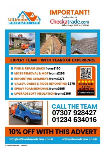2 Phonebox Magazine | June 2025EXPERT TEAM - WITH YEARS OF EXPERIENCE10% OFF WITH THIS ADVERTCALL THE TEAMIMPORTANT!FIND & REPAIR LEAKS from %u00a3150MOSS REMOVAL & MOT from %u00a3295REPOINTING CHIMNEYS from %u00a3275VALLEY, GABLE & RIDGE REPOINTING %u00a3375SPRAY FOAM REMOVAL from %u00a3995UPGRADE LOFT INSULATION from %u00a3395 info@ultimateroofcare.co.uk ultimateroofcare.co.ukCHECK OUR 5 STAR REVIEWS ON07307 92842701234 63401607307 92842701522 42461602.qxp_Layout 1 19/05/2025 08:48 Page 101234 634016