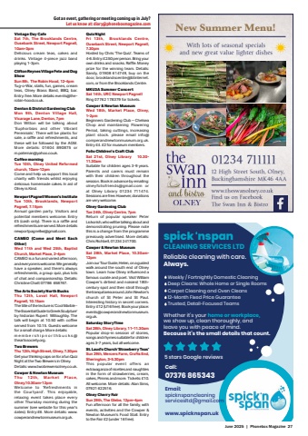 June 2025 | Phonebox Magazine 27Got an event, gathering or meeting coming up in July? Let us know at: diary@phoneboxmagazine.comVintage Day CafeSat 7th, The Brooklands Centre, Ousebank Street, Newport Pagnell, 10am-3pmDelicious cream teas, cakes and drinks. Vintage 4-piece jazz band playing 1-3pm.Clifton Reynes Village Fete and Dog ShowSun 8th, The Robin Hood, 12-4pmTug-o-War, stalls, fun, games, cream teas, Olney Brass Band, BBQ, bar. Entry: free. More details: events@therobin-hood.co.uk.Denton & District Gardening ClubMon 9th, Denton Village Hall, Vicarage Lane, Denton, 7pmDon Witton will be talking about %u2018Euphorbias and other Vibrant Perennials%u2019. There will be plants for sale, a raffl e and refreshments, and these will be followed by the AGM. More details: 01604 890875 or m.pateman@yahoo.co.uk.Coff ee morningTue 10th, Olney United Reformed church, 10am-12pmCome and help us support this local charity with friends whilst enjoying delicious homemade cakes. In aid of Olney is Kind.Newport Pagnell Women%u2019s InstituteTue 10th, Brooklands, Newport Pagnell, 7.15pmAnnual garden party. Visitors and potential members welcome. Entry %u00a35 (cash only). There is a raffl e and refreshments are served. More details newportpagnellwi@gmail.com.CAMEO (Come and Meet Each Other)Wed 11th and Wed 25th, Baptist Church, Market Place, 2-4pmCAMEO is a fun and varied afternoon, and everyone is welcome. We generally have a speaker, and there%u2019s always refreshments, a group quiz, plus lots of chat and companionship. Details: Christine Chatt 07786 658767.The Arts Society North BucksThu 12th, Lovat Hall, Newport Pagnell, 10.15amThe title of the lecture is %u2018Cool Marble - The Essential Guide to Greek Sculpture%u2019 by historian Rupert Willoughby. The talk will begin at 10.50 with coffee served from 10.15. Guests welcome for a small charge. More details:membershipnorthbucks@theartssociety.org.Two BrewersThu 12th, High Street, Olney, 7.30pmGet your thinking caps on for a fun Quiz Night at the Two Brewers in Olney. Details: www.twobrewersolney.co.uk.Cowper & Newton MuseumT h u 1 2 t h , M a r ke t P l a ce, Olney,10.30am-12pmWelcome to %u2018Refreshments in the Courtyard%u2019. This enjoyable, relaxing event takes place every other Thursday morning during the summer (see website for this year%u2019s dates). Entry:%u00a36. More details: www.cowperandnewtonmuseum.org.uk.Quiz NightFri 13th, Brooklands Centre, Ousebank Street, Newport Pagnell, 7.30pmHosted by Chris %u2018The Quiz%u2019. Teams of 4-6. Entry: %u00a32.50 per person. Bring your own drinks and snacks. Raffl e. Money prize for the winning team. Details: Sandy, 01908 614749, buy on the door, brooklandscentre@btinternet.com, or from the Brooklands Centre.MKU3A Summer ConcertSat 14th, URC Newport PagnellRing 07762 178379 for tickets.Cowper & Newton MuseumWed 18th, Market Place, Olney, 1-2pmBeginners Gardening Club %u2013 Chelsea Chop and maintaining Flowering Period, taking cuttings, increasing plant stock. please email info@comperandnewtonmuseum.org.uk. Entry %u00a34. %u00a32 for museum members.Folio Children%u2019s Craft ClubSat 21st, Olney Library 10.30-11.30amSuitable for children ages 3-9 years. Parents and carers must remain with their children throughout the session. Book in advance by emailing: olneyfoliofriends@gmail.com or at Olney Library 01234 711474. Sessions are free. However, donations are very welcome.Olney Gardening ClubTue 24th, Olney Centre, 7pmReturn of popular speaker Peter Lickorish, who will be talking about and demonstrating pruning. Please note this is a change from the programme previously advertised. More details: Chris Richbell, 01234 241700.Cowper & Newton MuseumSat 28th, Market Place, 10.30am12pmJoin our Tour Guide, Helen, on a guided walk around the south end of Olney town. Learn how Olney infl uenced a famous curate and poet. Visit William Cowper%u2019s dirtiest and noisiest 18thcentury spot and then stroll through the tranquil area around John Newton%u2019s church of St Peter and St Paul. Interesting history in secret corners. Entry: %u00a312 (U16 free). Book your place: events@cowperandnewtonmuseum.org.uk.Saturday StoryTimeSat 28th, Olney Library, 11-11.30amPopular drop-in session of stories, songs and rhymes suitable for children ages 3-7 years, but all welcome.St. Laud%u2019s Church %u2018Strawberry Teas%u2019Sun 29th, Mercers Farm, Crofts End, Sherington, 3-5.30pmThis popular event offers an extravaganza of niceties and naughties in the form of strawberries, cream, cakes, Pimms and more. Tickets: %u00a310. All welcome. More details: Alan Sims, 07921 622516.Olney Cherry FairSun 29th, The Glebe, 12pm-4pmFun afternoon for all the family, with events, activities and the Cowper & Newton Museum%u2019s Food Stall. Entry to the Fair %u00a32 (under 16 free).12 High Street South, Olney, Buckinghamshire MK46 4AA01234 711111New Summer Menu!www.theswanolney.co.ukFind us on FacebookThe Swan Inn & BistroWith lots of seasonal specials and new great value lighter dishes Reliable cleaning with care.Always.spick nspanCLEANING SERVICES LTD Weekly / Fortnightly Domestic Cleaning Deep Cleans: Whole Home or Single Rooms Carpet Cleaning and Oven Cleans 12-Month Fixed Price Guarantee Trusted, Detail-Focused TeamsWhether it%u2019s your home or workplace, we show up, clean thoroughly, and leave you with peace of mind.Because it%u2019s the small details that count.Call:07376 865343Email:spicknspancleaningservicesltd@gmail.comwww.spicknspan.uk5 stars Google reviews