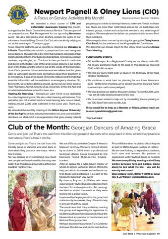 June 2025 | Phonebox Magazine 39We attended a short course of CPR and Defi brillator Awareness Training this month, arranged by the South Central Ambulance Service. This was part of our preparation and Risk Management for our upcoming Motoramaevent. We also delivered a short briefi ng session for some of our volunteers from the Olney Classic Car Club, who are kindly helping us out at this event again. Thank you, guys.As we reported last time, we%u2019ve recently re-stocked our Message In A Bottle. These little pots contain a pre-printed form and two green cross stickers. The user fi lls in the form that contains information that clearly identifi es them, their basic medical details, emergency contact numbers, any allergies, etc. The form is then put back in the bottle and stored in the fridge. One of the green cross stickers is put on the door of the fridge, and the other is put on the inside of the front door. Lions Clubs promote this scheme because we believe that this gives older or vulnerable people more confi dence about their treatment in an emergency. It also gives peace of mind to relatives and friends that essential information will be available in an emergency situation. So, this month, we%u2019ve been dashing around, giving out our MIAB pots to Peak Pharmacy, Age UK Charity Shop, University of the 3rd Age and to individuals who have asked for them, too.Hearing Aid Recycling %u2013 Retired Lion John Ferris is our champion for collecting hearing aids. We also collect hearing aid batteries. This period he sent off another batch of used hearing aids, on our behalf, making around 2,000 units collected in this Lions year. Thank you, John.We attended the monthly meeting of the Milton Keynes %u2018University of the 3rd Age%u2019 to deliver a short presentation on Lions, and to further distribute our MIAB. U3A is an organisation that gives (mainly retired) Newport Pagnell & Olney Lions (CIO)people opportunities to develop interests, make new friends and have fun. There are more than 1,000 U3As across the UK. Each U3A runs interest groups, chosen and run by their members, on a wide range of subjects. We were pleased to deliver our presentation to around 90 of their members.We arranged a short concert by a local guitar group, the %u2018Olney Hearts Club Band%u2019, for the residents at the Kingsley Health Care Home.We delivered our annual report to the Olney Town Council Annual Town Meeting.FUNDRAISING EVENTS%u2022 Gift Aid Receipts. As a Registered Charity, we are able to claim Gift Aid on any donations made to the Club. In this period we received %u00a3260 in Gift Aid receipts.%u2022 We held our Curry Night and Fun Quiz on the 15th May, at the Naga Tandoor Restaurant.%u2022 We continue to work hard on planning for our Lions Motorama 2025 - (at the time of writing, we%u2019ve already received around %u00a3700 of sponsorships %u2013 with more pledged).%u2022 We have booked our stall for this year%u2019s Cherry Fair on the 29th June %u2013 we are all really looking forward to this one.%u2022 We have been invited to help out by marshalling the car parking at the TOG RiverFest event on 6th July.If you would like to help, as a Member or Friend, please reach out to us at npandolions@gmail.comThat%u2019s all folks!A Focus on Service Activities this Month! (Registered Charity Number 1184025)Club of the Month: Georgian Dancers of Amazing GraceCome and join us! That%u2019s the call from this friendly group of dancers who step back in time when they practice new steps. Here%u2019s how it works.Come and join us! That%u2019s the call from this friendly group of dancers who step back in time when they practice new steps. Here%u2019s how it works.Are you looking to try something new, meet new people and have fun whilst learning new skills? If so, this dance group with a diff erence could be right for you.We are affiliated with the Cowper & Newton Museum in Olney. We were formed almost by accident in 2016 when a professional Georgian dance group arranged by the Museum found themselves doublebooked. After an appeal for a tutor, Stuart Tranter of Cheek to Cheek School of Dance off ered to help, and within four weeks we had learnt our fi rst dance and performed it as part of the Museum%u2019s Georgian Day event. By chance, Roy and Jo Walker, who were experienced Playford Dancers (dances from the late 17th and early to mid-18th century), decided to attend the event as they were looking for a group to join. Impressed by the progress that the group had made in only four weeks, they off ered to help in any way that they could. The result was that they ended up running the group and expanding its repertoire to facilitate public performances not only at the Museum but at a number of care homes and National Trust properties. We have also been featured on TV in Celebrity Antiques Roadshow and performed before Prince William when he visited Milton Keynes as part of Milton Keynes Festival of History.We are now looking to expand our numbers, both men and women. No partner or experience with Playford dance is needed. We meet every Friday evening at the Olney Centre between 7pm and 8.30pm. Come along to see what it%u2019s like - you will be warmly welcomed! More details: Helen, 07967 117019 or email Roy & Jo Walker: walkerrd@sky.com.