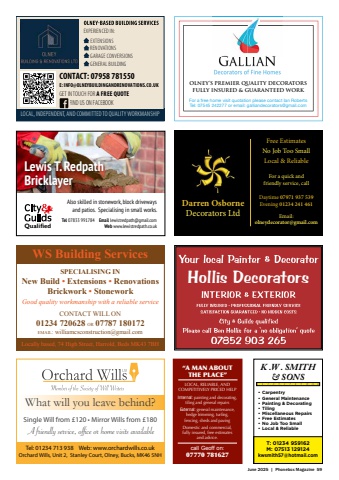 June 2025 | Phonebox Magazine 59WS Building ServicesSPECIALISING INNew Build %u2022 Extensions %u2022 RenovationsBrickwork %u2022 StoneworkGood quality workmanship with a reliable serviceCONTACT WILL ON01234 720628 OR 07787 180172email: williamcsconstruction@gmail.comLocally based, 74 High Street, Harrold, Beds MK43 7BHLewis T. RedpathBricklayerAlso skilled in stonework, block driveways and patios. Specialising in small works.Tel 07833 991784 Email lewistredpath@gmail.comQualified Web www.lewistredpath.co.ukDarren OsborneDecorators LtdFree EstimatesNo Job Too SmallLocal & ReliableFor a quick and friendly service, callDaytime 07971 937 539Evening 01234 241 461Email: olneydecorator@gmail.comHollis DecoratorsOlney%u2019s Premier Quality DecoratorsFully Insured & Guaranteed WorkFor a free home visit quotation please contact Ian RobertsTel: 07545 242277 or email: galliandecorators@gmail.comLOCAL, RELIABLE, AND COMPETITIVELY PRICED HELP Internal: painting and decorating,tiling and general repairsExternal: general maintenance, hedge trimming, turfing, fencing, sheds and pavingDomestic and commercial, fully insured, free estimates and advice.%u201cA MAN ABOUT THE PLACE%u201dcall Geoff on:07770 781627K .W . SMITH& SONS%u2022 Carpentry %u2022 General Maintenance%u2022 Painting & Decorating%u2022 Tiling%u2022 Miscellaneous Repairs%u2022 Free Estimates%u2022 No Job Too Small%u2022 Local & ReliableT: 01234 959162M: 07513 129124kwsmith57@hotmail.comEXPERIENCED IN: EXTENSIONSRENOVATIONS GARAGE CONVERSIONS GENERAL BUILDERCONTACT: 07958 781550 E: INFO@OLNEYBUILDINGANDRENOVATIONS.CO.UKGET IN TOUCH FOR A FREE QUOTE FIND US ON FACEBOOKLOCAL, INDEPENDENT, AND COMMITTED TO QUALITY WORKMANSHIPINGWhat will you leave behind? A friendly service, office or home visits availableTel: 01234 713 938 Web: www.orchardwills.co.ukOrchard Wills, Unit 2, Stanley Court, Olney, Bucks, MK46 5NHSingle Will from %u00a3120 %u2022 Mirror Wills from %u00a3180