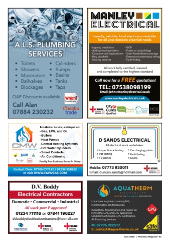 June 2025 | Phonebox Magazine 61D.V. BoddyElectrical ContractorsDomestic %u2022 Commercial %u2022 IndustrialAll work part P approved01234 711116 or 07841 196227dvboddyelectricalcontractors@hotmail.comD SANDS ELECTRICALMobile: 07773 930011Email: duncan.sands@hotmail.comAll electrical work undertakenInspection + testingPat testingTV points Car charging pointsFault findingEICRSRegistered no: 927666M: 07776 922517E: contact@aqua-therm.co.ukLocal area engineer covering MK, Northampton, Bedford areas.Installation, Maintenance and Repair on NATURAL GAS and LPG appliancesLandlord Certifi cates, LPG Certifi cates, All Plumbing servicesA.L.S. PLUMBING SERVICESCall Alan07884 230232OAP Discounts available%u2022 Toilets%u2022 Showers%u2022 Macerators%u2022 Ballvalves%u2022 Blockages%u2022 Cylinders%u2022 Pumps%u2022 Basins%u2022 Tanks%u2022 Taps Friendly, reliable, local electrician available for all your domestic electrical needs- Lighting installation - Adding/moving sockets - Consumer unit replacement- Ring doorbells- Security cameras- EICR- Power to outbuildings- Solar Panels/Battery storage- Extension/conservatory wiring- Fault findingAll work fully certified, insuredand completed to the highest standard Call now for a quotation!www.manleyelectrical.co.ukTEL: 07538098199Email: john@manleyelectrical.co.ukFREEContact Chris: 07706 077132 / 01234 958862or visit WWW.CMWGAS.COMFamily Run Business Based in Olney