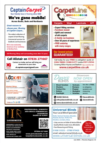 June 2025 | Phonebox Magazine 63%u2022 The widest collection of carpets & hard flooring%u2022 Commercial services for landlords and businessesWe%u2019re now exclusively based out of our workshop at Northey Farm.Call Alistair on 07836 271667We%u2019ve gone mobile!Across Bucks, Beds and Northantsal.captaincarpet@gmail.comContact us today and we will bring our showroom to your doorGreat reasons to choose your flooring at Captain Carpet...Still flooring Olney and surrounding areas after 35 yearsEst 1993Carpets %u2022 Vinyl %u2022 Laminate %u2022 LVT%u2022 Expert fi tting services%u2022 Furniture moved%u2022 Uplift and removal  of old carpets%u2022 A family run business%u2022 Over 50 years of experience%u2022 FREE underlay  with many rangesOur lowest pricesGUARANTEED!Call today for your FREE no obligation quote on01604 708000 / 01908 614777 mobile 07971 276740 Covering Milton Keynes and Bedford 7 days a week 9am-9pmwww.carpetline.co.ukShowroom NOW OPENby appointment%u2022 Wood Venetian%u2022 Shutters%u2022 Perfect Fits%u2022 Rollers%u2022 Day/Night01908 502141info@davesblinds.co.ukwww.davesblinds.co.ukDavesBlindsdavesblinds%u2022 Verticals%u2022 Romans%u2022 Pleated%u2022 Skylights%u2022 VenetianWe offer a FREE, no obligation, quotation and measuring service.%u2019Universal BlindsYour Local Blind SpecialistRoller, Vertical, Venetian, Wooden, Pleated, Roman, Perfect Fit, Shutters, Curtains, Velux%u2022 3 day service on Roller & Vertical Blinds%u2022 Quality Blinds made more affordable%u2022 Free Measuring and Fitting01908 510333 %u2022 07980 979420email: sales@universal-blinds.co.ukwww.universal-blinds.co.ukBuy one Roller or Vertical Blind get one half price24 HOUR LOCKSMITH SERVICESBEDFORDAlastair BatesYour local trusted LocksmithT: 01234 924 997 | M: 07874 285661E: alastair.bates@lockfit.co.ukNo callout chargeFixed pricing guaranteedFast 24/7 responsePROFESSIONAL, DOMESTIC AND SMALL COMMERCIAL LOCKSMITHBASED IN OLNEY07354 017 222www.jirlocksmith.co.ukhelp@jirlocksmith.co.ukEMERGENCY LOCK IN/OUTBROKEN KEY EXTRACTIONMINOR ADJUSTMENTSSECURITY UPGRADESNEW HOME NEW LOCKSADDITIONAL SECURITYNEW INSTALLSSINGLE KEY HOME LIFE