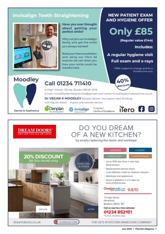 June 2025 | Phonebox Magazine 7NEW PATIENT EXAMCall 01234 7114109 High Street, Olney, Bucks MK46 4EBemail: moodleydentalpractice@gmail.com www.moodleydentalpractice.co.ukDr VEGAN K MOODLEY BDS(SA) IQE(UK) Dip Implant Dent RCS(Eng) GDC Reg No: 101543 %u2022 Implant and cosmetic dentistHave you ever thought about getting your perfect smile?Why not join our Invisalign family and get the smile you always wanted!Book your free consultation and using our ITero 3d scanner we can show you how your smile could be transformed.Invisalign Teeth StraighteningAND HYGIENE OFFEROnly %u00a385(Regular value %u00a3144)Includes:A regular hygiene visitFull exam and x-rays*Offer subject to change and for a limited time onlydreamdoors.co.uk THE UK%u2019S #1 KITCHEN MAKEOVER COMPANYBEFOREDO YOU DREAM OF A NEW KITCHEN?by simply replacing the doors and worktops20% DISCOUNTfor this month onlyMODERN CLASSICTRADITIONAL CONTEMPORARYAFTERUK MANUFACTURED%u203a Up to 50% less than a new fully fitted kitchen%u203a Replacement kitchen doors%u203a Cost effective made to measure solution%u203a Worktops and appliances%u203a Quick installation in 2-3 days by local professionals73 High Street,Kempston,Bedford, MK42 7BTCall us now for a free estimate:01234 8521519.8/10*Terms & Conditions Apply