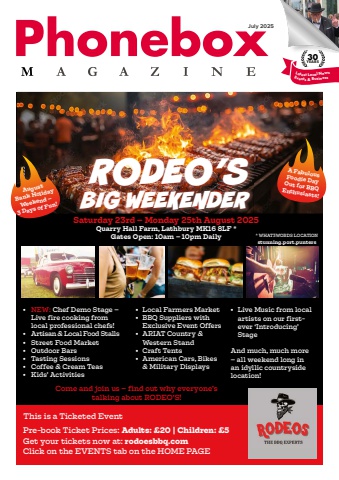 July 2025 | Phonebox Magazine 130YEARSLatest Local News Events & BusinessJuly 202530YEARSLatest Local News Events & BusinessJuly 2025RODEO%u2019SBIG WEEKENDERSaturday 23rd %u2013 Monday 25th August 2025Quarry Hall Farm, Lathbury MK16 8LF *Gates Open: 10am %u2013 10pm DailyPre-book Ticket Prices: Adults: %u00a320 | Children: %u00a35Get your tickets now at: rodoesbbq.comClick on the EVENTS tab on the HOME PAGEAugust Bank Holiday Weekend %u2013 3 Days of Fun!A FabulousFoodie Day Out for BBQEnthusiasts!%u2022 NEW: Chef Demo Stage %u2013 Live fire cooking from local professional chefs!%u2022 Artisan & Local Food Stalls%u2022 Street Food Market%u2022 Outdoor Bars%u2022 Tasting Sessions%u2022 Coffee & Cream Teas%u2022 Kids%u2019 Activities%u2022 Local Farmers Market%u2022 BBQ Suppliers with Exclusive Event Offers%u2022 ARIAT Country & Western Stand%u2022 Craft Tents%u2022 American Cars, Bikes & Military Displays%u2022 Live Music from local artists on our first- ever %u2018Introducing%u2019 StageAnd much, much more %u2013 all weekend long in an idyllic countryside location!This is a Ticketed EventCome and join us %u2013 find out why everyone%u2019s talking about RODEO%u2019S!* WHAT3WORDS LOCATIONstunning.port.punters