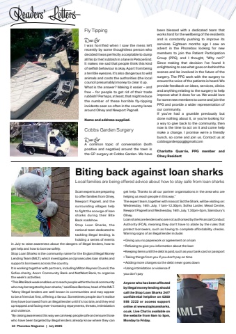 10 Phonebox Magazine | July 2025Reaff rs%u2019 Le%u001a ersFly TippingDear SirI was horrified when I saw the mess left recently by some thoughtless person who decided it was perfectly acceptable to dump all his (or her) rubbish in a lane in Petsoe End.It makes me sad that people think this kind of selfi sh behaviour is okay. Apart from being a terrible eyesore, it%u2019s also dangerous to wild animals and costs the authorities (the local council presumably) money to clear it up. What is the answer? Making it easier %u2013 and free %u2013 for people to get rid of their trade rubbish? Perhaps, at least, that might reduce the number of these horrible fly-tipping incidents seen so often in the country lanes around Olney and Newport Pagnell.Name and address supplied.Cobbs Garden SurgeryDear SirA common topic of conversation (both positive and negative) around the town is the GP surgery at Cobbs Garden. We have been blessed with a dedicated team that works hard for the wellbeing of the residents and is constantly pushing to improve its services. Eighteen months ago I saw an advert in the Phonebox looking for new members to join the Patient Participation Group (PPG), and I thought, %u201cWhy not?%u201d Since making that decision I%u2019ve found it enlightening to see what goes on behind the scenes and be involved in the future of the surgery. The PPG work with the surgery to ensure the voice of the patients is heard. We provide feedback on ideas, services, clinics and anything relating to the surgery to help improve what it does for us. We would love for some new members to come and join the PPG and provide a wider representation of our community.If you%u2019ve had a grumble previously but done nothing about it, or you%u2019re looking for a way to give back to the community, then now is the time to act on it and come help make a change. I promise we%u2019re a friendly bunch, so come and join us. Contact us at cobbsgardenppg@gmail.comCharlotte Quarrie, PPG member and Olney ResidentBiting back against loan sharksLocal families are being off ered advice about how to stay safe from loan sharksScam experts are preparing to off er families from Olney, Newport Pagnell, and the surrounding villages help to fi ght the scourge of loan sharks during their Bite Back roadshow.Stop Loan Sharks, the national team dedicated to tackling illegal lending, is holding a series of events in July to raise awareness about the dangers of illegal lenders, how to get help and how to borrow safely.Stop Loan Sharks is the community name for the England Illegal Money Lending Team (IMLT), which investigates and prosecutes loan sharks and supports borrowers across the country.It is working together with partners, including Milton Keynes Council, the Sofea charity, Acorn Community Bank and NatWest Bank, to organise the week%u2019s activities.%u201cThis Bite Back week enables us to reach people within the local community who may be targeted by loan sharks,%u201d said Dave Benbow, head of the IMLT.%u00a0%u201cMany illegal lenders are well known in communities and may appear to be a friend at fi rst, off ering a favour. Sometimes people don%u2019t realise they have borrowed from an illegal lender until it%u2019s too late, and they end up trapped and facing ever-increasing repayments, threats, intimidation and violence.%u201cBy raising awareness this way, we can keep people safe and ensure those who have been targeted by illegal lenders already know where they can get help. Thanks to all our partner organisations in the area who are helping us reach people in this way.%u201dThe expert team, together with mascot Sid the Shark, will be visiting on:Wednesday, 16th July, 11am-12.30pm, Sofea Larder, Mead Centre, Newport Pagnell and Wednesday, 16th July, 1.30pm-3pm, Sainsbury%u2019s Olney.Loan sharks are lenders who are not authorised by the Financial Conduct Authority (FCA), meaning they don%u2019t have to abide by the rules that protect borrowers, such as having to complete aff ordability checks.%u00a0 Warning signs of an illegal lender include:%u2022 Giving you no paperwork or agreement on a loan %u2022 Refusing to give you information about the loan %u2022 Keeping items until the debt is paid, such as your bank card or passport%u2022 Taking things from you if you don%u2019t pay on time %u2022 Adding more charges so the debt never goes down %u2022 Using intimidation or violence if you don%u2019t payAnyone who has been aff ected by illegal money lending should call the Stop Loan Sharks 24/7 confi dential helpline on 0300 555 2222 or access support online at www.stoploansharks.co.uk. Live Chat is available on the website from 9am to 5pm, Monday to Friday.
