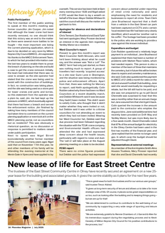 16 Phonebox Magazine | July 2025Mercury ReportPublic ParticipationThe first member of the public wishing to speak at this month%u2019s meeting was former councillor Jim Cooper. Jim noted that although the tower crane had been recently removed, no one should think that this victory was an end to the matter as there were several more battles to be fought %u2013 the most important one being the current planning application, which is due to be decided on very soon by Milton Keynes City Council (MKCC). Jim expressed his thanks to the MKCC Enforcement Team, to which he had provided information over the last two years to enable them to prove the breach of planning on the site and build a case to get the crane removed. Initially, the team had indicated that there was no case to answer as the site operator had stated that the crane was being used to assist with the construction of buildings. In fact, no construction was taking place, and the site was being used as a store yard for tower cranes and parts and lorries, so this statement from the operator was a plain lie, said Jim. He had kept up the pressure on MKCC, which eventually agreed that there had been a breach and served the enforcement notice. Jim fi nished by asking how many members of the council had taken time to comment on the current planning application or even look at it on the MKCC planning portal, not as councillors but as residents? This was obviously a rhetorical question, as no discussion or response is permitted to matters raised under public participation.Next to speak was Nigel Birrell (coincidentally another former member of the council from many years ago). Nigel said that on November 11th this year, he and other members of his family will be attending the evening memorial at the Menin Gate in Ypres and have applied to lay a wreath. This service has been held at 8pm every evening since 1929 and Nigel asked if OTC would like them to lay a wreath on behalf of the town. Mayor Debbie Whitworth said the council will discuss the matter and get back to him.Apologies for absence and declarations of interestChris Tennant, Dan Rowland and David Tyler had sent apologies. Mary Prosser declared an interest in the agenda item regarding Yardley Manor as a resident.Ward Councilor%u2019s reportPresent to give this month%u2019s report was Ward Councilor Keith McLean, who said he%u2019d been thinking about what he could say, and the answer was %u201cNot a Lot!%u201d The MKCC %u2018term%u2019 had only just started, so there was nothing much to report. A group of travellers had recently %u2018acquired access%u2019 to a site near Gunn Lane in Sherington, and the situation was being monitored by police and enforcement officers. Apart from that, there was nothing for Mercury to report, said Keith apologetically. Colin Rodden asked why there had been no Ward Councilors at a recent disability march, and Debbie Whitworth said it was because they hadn%u2019t been invited. This didn%u2019t seem to satisfy Colin, who thought that it didn%u2019t matter whether they were invited or not, but Debbie said it was unfair to criticise councillors for not attending an event to which they had not been invited. Wearing her Ward Councilor hat, Debbie said that due process had been followed regarding the situation with the TCUK crane company, and Environmental Health officers had attended the site and had expressed deep concern about the health issues, particularly with regard to noise and dust. The %u2018call in%u2019 will take place at the August planning meeting on a date to be decided.PCSO reportThere were no crime figures provided, but Debbie said the police had expressed concern about potential under-reporting of retail crime nationally and were emphasising the need for residents and businesses to report all crime. Town Clerk Jane Brushwood reported that a theft from a vehicle in the East Street car park had been captured on CCTV, and a certain %u2018local resident low-life%u2019 had been very clearly identifi ed, which would be %u2018another nail in his coffi n%u2019. The footage had been provided to the police, who are working to provide a case against this known individual.%u00a0Expenditure and budgetCoin Rodden questioned a relatively large payment to an individual. Jane Brushwood explained that there had been a number of problems with Market Place toilets, which had needed repairs. This person is also a member of the team of three that maintains the cemetery, but in future this will be broken down to repairs and cemetery maintenance, she said. Colin also questioned the payment to MKCC of %u00a31,048 a month for rates on the old and unused Football Club building. Jane said she would eventually be requesting a rebate, but the bill still had to be paid, and she was not prepared to go to jail! David Chennells was surprised to hear that this was a monthly rather than an annual charge but Jane assured him that she%u2019d get it back. Colin queried the increase in the amount paid to the contractor who empties the dog poo bins. Jane said additional bins had recently been provided on Drift Way and Yardley Manor, but was more likely due to a fi ve-week month. David Chennells noted that 67% of the annual budget for electricity in the Olney Centre had been used in the fi rst two months of the fi nancial year, and Jane replied that the centre no longer used gas. In which case the budget should be adjusted thought David.Representatives at external meetingsAs a member of the Ann Hopkins Smith Alms Houses Trustees, Mary Prosser reported that she and David Chennells had recently New lease of life for East Street Centre The trustees of the East Street Community Centre in Olney have recently secured an agreement on a new 25-year lease for the building and associated grounds. It gives the centre stability as it plans for the next few years.%u201cThis is great news for both the trustees and for our various user groups,%u201d said trustee Trevor Aldred.%u201cIt gives us long-