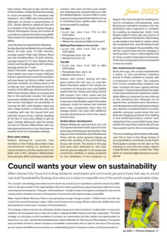 July 2025 | Phonebox Magazine 17June 2025 had a soiree. %u2018Not just us two, but the rest of the trustees, %u2019 interjected David hurriedly, to much amusement. The residents had enjoyed it, and a BBQ was being planned. Although not strictly a representative of OTC, Deirdre Bethune explained that she is a member of the Cobbs Garden Surgery Patient Participation Group and invited all councillors to attend the forthcoming AGM.Data results from Speed Indicating Devices (SIDs)Jane Brushwood reported the following:Yardley Road by the Middle School travelling North 20 mph zone: 31,438 vehicles, average speed 19.66 mph. Weston Road top end travelling West: 52,349 vehicles, average speed 27.72 mph. Weston Road bottom end travelling East: 56,467 vehicles, average speed 26.17 mph.David Chennells expressed the opinion that it wasn%u2019t very wise to locate a SID just before a speed bump as even the speeders will slow down, but Richard Hillier said he had seen vehicles not slowing down at all as they go over. Jane Brushwood said the location of the SIDs was determined by the MKCC Road Safety Offi cer and suspected that in this particular location the speed bump was installed after the SID. She said she would investigate the possibility of moving the SID. Colin Rodden observed that a large number of vehicles were still travelling well over the speed limit and said that anyone hit by a vehicle travelling at 40 mph or more was unlikely to get up again. Debbie Whitworth said the results are sent to Thames Valley Police, who can take appropriate action once they have six months%u2019 worth of comparable readings.River water testingDebbie Whit wor th repor ted that members of the Fishing Association have recommenced testing for pollution at various locations, and the results were %u2018not great%u2019 and, in fact, showed a deterioration since last year, with E.coli being of particular concern. She read out the E.coli results and subsequently provided Mercury with the detailed fi gures.%u00a0A level of 900 or more Colony Forming Units (CFU)/100ml for E.coli is considered poor quality water and not recommended for bathing:The Weir%u00a0%u2022%u2002 E.coli has risen from 770 to 934 CFU/100ml%u2022%u2002 Phosphate from .2 to 1.98%u2022%u2002 Nitrate has remained stable at around 5Bathing Place steps at rec to river%u00a0%u2022%u2002 E.coli has risen from 752 to 882 CFU/100ml%u2022%u2002Phosphates from .3 to .48%u2022%u2002Nitrates from 5 to 7.5The Mill%u2022%u2002 E.coli has risen from 793 to 884 CFU/100ml%u2022%u2002 Phosphates from .26 to .45%u2022%u2002 Nitrates from 5 to 7.5Debbie said further testing will take place before the raft race on July 6th. David Chennells asked if the results are consistent all along the river, and Debbie replied that the results were being shared with groups from other areas and the Environmental Agency to ascertain if that is the case. Colin Rodden asked if the water company could be named and shamed since they consistently claim that the sewage system can cope with additional housing developments when that clearly isn%u2019t the case.Yardley Manor developmentDebbie Whitworth reported that not a lot of progress had been made, apart from the previously noted dog poo bin provision. Two dog poo bins interjected Jane Brushwood! There will be some general tidying up before the meeting of the joint Steering Group next month. The drains to the play area have been attended to, she said, and the ground adjacent to the proposed community building is being prepared for the installation of the sculpture on August 2nd, even though the building isn%u2019t due for completion until November. Jane Brushwood reminded members that the developers were supposed to complete the building by September 2023. Colin Rodden asked if there was any chance of getting a refund of the Section 106 funding, as the builders had failed to deliver within the contracted time. Jane Brushwood said she would investigate the possibility. How will the council know that the drainage is working when it hasn%u2019t rained signifi cantly for three months? Asked David Chennells. There was a long pause, and no one seemed to have an answer.Non-resident burial requestsSome time ago, the council implemented a policy of only permitting cemetery burials of Olney residents or people with a connection to the town. Two requests from former longstanding residents had been received and were agreed without discussion. This prompted David Chennells to ask if permission was required to scatter ashes (Mercury assumed he was referring to the cemetery) and, although not an agenda item, provoked some discussion. Jane Brushwood confi rmed that permission was required, prompting David to wonder whether everyone would know that and what was stopping someone from walking in and scattering Granny%u2019s ashes? Jane replied that if the council didn%u2019t know, there wouldn%u2019t be much they could do about it, but they wouldn%u2019t ask for them to be picked up.The next meeting will be held on Monday, July 7th at 7pm in the Olney Centre. If you would like to contribute to the Public Participation section at the start of the meeting or any time the mayor deems it appropriate, please contact the Town Clerk at townclerk@olneytowncouncil.gov.uk.Council wants your view on sustainability Milton Keynes City Council is inviting residents, businesses and community groups to have their say on a bold new draft Sustainability Strategy that sets out a vision to make MK one of the world%u2019s leading sustainable cities.The council%u2019s new strategy describes how the whole city and all council operations could be net zero by 2030, which is 20 years ahead of the legal deadline. Net zero means greenhouse gases have been balanced out by reducing harmful emissions. This goal %u2013 while ambitious %u2013 is built on years of progress, including the city council cutting carbon emissions by tens of thousands of tonnes and reducing its energy use by 80%. Milt