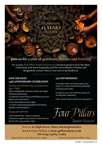 July 2025 | Phonebox Magazine 21Visit us: 60 High Street, Olney, BuckinghamshireBook & Order Online at www.4pillarsolney.co.ukTel: 01234 714083 / 711563Open: Sundays 1%u201311pm | Mon%u2013Sat 5.30%u201311.30pm Find us on Facebook: Four Pillars - OlneyFour PillarsTandoo%u0012 RestaurantCELEBRATING25 YEARS IN OLNEYFour PillarsJoin us for a year of gratitude, fl avour and festivityFor 25 years, Four Pillars Tandoori Restaurant has been proud to serve the Olney community with warm hospitality and the rich traditions of Indian and Bangladeshi cuisine. Now, it%u2019s our turn to say thank you.25% OFF MONDAYSFrom July to the end of November 2025, enjoy 25% off your food bill every Monday evening (eat-in only).Our gift to you as we celebrate 25 years of serving this community.(Off er excludes drinks. Seafood surcharge applies.)SAVE THE DATE: 25th ANNIVERSARY CELEBRATIONTuesday 23rd & Wednesday 24th September5pm %u2013 11pmWe%u2019re marking this milestone with a two-night celebration featuring:%u2022 A special 5-course menu, with dishes you won%u2019t fi nd on our usual menu%u2022 Live entertainment each night%u2022 A warm, welcoming atmosphere for friends, families, and loyal guests%u2022 Pre-booked only %u2013 deposit required.Call now to register your interest and be fi rst on the list: Tel: 01234 714083 / 711563%u00a325.95 per person