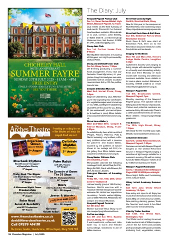 26 Phonebox Magazine | July 2025Newport Pagnell Probus ClubTue 1st, Swan Revived Hotel, High Street, Newport Pagnell, 12.15pmClub meets on the first Tuesday of each month. This month: Fun Quiz and New Members invitation. More details or to visit, contact: John Brimley, 019086 05378, johnbrimley37@btinternet.com, Neil Beeton, 01908 914771, neilbeeton@sky.com.Olney Jazz ClubTue 1st, Carlton House Club, 8-10pmThe Big Bear Stompers are playing at this great jazz night sponsored by Orchard Press.Olney and District Flower ClubTue 1st, Olney Centre, 7.30pm DIY Evening producing a summer floral arrangement. If you have any favourite flowers/greenery in your garden bring them and your own vase. Committee will be pleased to advise new members. Entry: %u00a310. Tea, coff ee, biscuits free.Cowper & Newton MuseumWed 2nd, Market Place, Olney, 1-2pmBeginners Gardening Club. Whether you%u2019re new to growing your own fl owers and vegetables or just want to brush up on your skills, our Beginners Gardening Club is the perfect place for you. Entry: %u00a32 per session with your annual pass (or %u00a34 without a pass). More details: www.cowperandnewtonmuseum.org.uk.Three Hares GalleryWed 2nd-Wed 30th, Cowper & Newton Museum, Olney, 11am4.30pmAn exhibition by two artists entitled %u2018People, Places, Patterns, Pots & Plants%u2019 featuring Lucy Mathers, a lifelong problem-solver with a passion for patterns and Susan Webb, inspired by the patterns of nature shown in her collage art. Entry to the gallery free. More details: www.cowperandnewtonmuseum.org.uk.Olney Senior Citizens ClubOlney Centre, 2-4pmThe popular club has the following meetings: Fri 4th, Whist\\Chat; Fri 11th, Bingo; Fri 18th, Say it with Flowers; Fri 25th, All about Libraries.Georgian Dancers of Amazing GraceFriday 4th, 11th, 18th, 25th, Olney Centre 7-8.30pm %u00a33Join our friendly group of 18th Century Dancers. Gentle exercise with a historical interest. New people warmly welcome. No partner nor experience necessary. Details: walkerrd@sky.com or 07967117019. Affi liated to the Cowper and Newton Museum.Newport Pagnell CarnivalSat 5th & Sun 6thTheme: %u2018Carnival Tells a Story%u2019. More info newportpagnellcarnival.comCoff ee morningsSat 5th and Sat 19th, Baptist Church, Olney, 10-11.30amA warm welcome, coffee and cake await you in warm and friendly surroundings. Donations in aid of Willen Hospice.The Diary: July Riverfest Comedy NightSat 5th, Riverfest Field, OlneyNew for this year, in the marquee on Riverfest fi eld, near swimming steps Olney. itsjustjokescomedy.square.siteRiverfest Duck Race & Raft RaceSun 6th, Emberton Park & Olney Recreation GroundDuck Race & Raft race start at Emberton Park, then on to the Recreation Ground in Olney for crafts food, drinks and live bands.Singing for the BrainMon 7th and Mon 21st, Heron%u2019s Lodge Guide Centre, Loughton LodgeAlzheimer%u2019s Society uses singing to bring people with dementia together in a friendly and stimulating activity. First and third Monday of each month with morning and afternoon sessions available. More details or to book a place, contact Alzheimer%u2019s Society, 01908 232612 or email miltonkeynes@alzheimers.org.uk.Newport Pagnell WITue 8th, Brooklands Centre, Newport Pagnell, 7pmMonthly meeting of the Newport Pagnell group. The speaker will be talking about the history of postcards. Visitors and potential members are welcome. Entry: %u00a35 (cash only). There%u2019s a raffl e and refreshments are served. More details: newportpagnellwi@gmail.com.Two BrewersThu 10th, High Street, Olney, 7.30pmGet ready for the monthly quiz night. Details: www.twobrewersolney.co.uk.A Summer SerenadeSat 12th, United Reformed Church, Newport Pagnell, 7.30pmSummer concert with Newport Pagnell Singers at the United Reformed Church in Newport Pagnell, singing a selection of light songs suitable for a summer%u2019s evening. We will be raising funds for Willen Hospice. Tickets: %u00a312 (U16 %u00a35) from Cambourne Travel.Newport Pagnell FundraiserSat 12, 1 Ousebank Street Newport Pagnell MK16 8AN 6pm-midnightDisco Night, Raffle and Fundraising event. %u00a320 per ticket.Olney Infant Academy Summer FairSat 12th July, Olney Infant Academy, 12%u20133pmFree entry and open to all. Enjoy live music from the school choir and brass band, BBQ, ice cream, bouncy castles, face painting, dancing, games, %u2018Soak the Teacher%u2019 and more! A fun-filled afternoon for the whole family.Charity Trailer AuctionSat 12th, The White Hart, Sherington, 7pmThe White Hart is hosting its annual trailer auction in aid of Willen Hospice.Join in this fun event and possibly pick up a bargain, with goods probably including fruit, vegetables, cakes, Presenting an exciting line-up of live theatre and music this August. Don%u2019t mi%u0005 out! www.thearchestheatre.co.uk david@thearchestheatre.co.ukCall 07879 414%u008f 0 The Arches Theatre, Church Farm, Clifton Reynes, Olney MK46 5DTRiverbank Rhythms3rd AugustBenefit concert in support of CentrePoint CharityTruly, Jack The Ripperwith %u2018Don%u2019t Go Into The Cellar%u2019 Theatre CompanyRobin HoodSense & Sensibilitywith DOT ProductionsPeter Rabbit17th Augustwith LOL TheatreThe Comedy of ErrorsSupersonic Queen(Queen Tribute)1st AugustSupersonic (Queen Tribute)1DefinitelyMightbe(Oasis Tribute)2nd Augustscan me!8th AugustA Midsummer Night%u2019s DreamFrankensteinwith British Touring Shakespeare9th August10th Augustwith The Shakespeare Circus24th AugustJeeves & WoosterIn Perfect Nonsensewith Underneath The Arches28th %u2013 30th AugustThe 39 StepsDuetswith The Backdoor Theatre Company28th %u2013 30th AugustGet your tickets today!Jeeves & WoosterIn Perfect Nonsensewith Underneath The Arches postponed until 2026CHICHELEY HALLSEE YOU THEREFREE ENTRYSUMMER FAYRE300TH ANNIVERSARYSTALLS %u2022 FOOD %u2022 FAMILY FUN %u2022 LIVE MUSICCHICHELEY HALL, CHICHELEYNEWPORT PAGNELL, BUCKINGHAMSHIRE MK16 9JJSUNDAY 20TH JULY 2025 - 11AM - 4PM