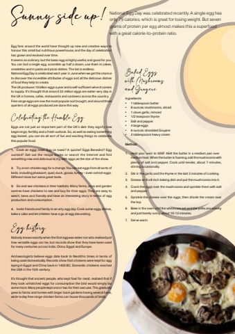 28 Phonebox Magazine | July 2025Egg fans around the world have thought up new and creative ways to honour this small but nutritious powerhouse, and the day of celebration has grown and evolved over time.It seems so ordinary, but the basic egg is highly useful, and good for you. You can boil a single egg, scramble up half a dozen, use them in cakes, omelettes and in pasta and pizza dishes. The list is endless.National Egg Day is celebrated each year in June when we get the chance to discover the incredible attributes of eggs and all the delicious dishes of food they help to create. The UK produces 10 billion eggs a year and is self-suffi cient when it comes to supply. It%u2019s thought that around 32 million eggs are eaten very day in the UK in homes, cafes, restaurants and canteens across the country. Free range eggs are now the most popular sort bought, and around three quarters of all eggs produced are done this way.Celebrat ing th e Humble EggEggs are not just an important part of the UK%u2019s diet: they signify new beginnings, fertility and a fresh outlook. So, as well as eating something egg-based, you can do all sort of fun and exciting things to celebrate this popular food.1. Cook an eggy meal. Egg on toast? A quiche? Eggs Benedict? Egg custard? Get out the recipe books or search the Internet and find something new and delicious to try, with eggs as the star of the show.2. Try a non-chicken egg for a change. You can eat eggs from all sorts of birds, including pheasant, quail, duck, goose, turkey %u2013 even ostrich eggs. Diff erent sizes but same great taste.3. Go and see chickens in their habitats. Many farms, zoos and garden centres have chickens to see and buy for their eggs. They are easy to watch, tame and friendly and have an interesting story in terms of egg production and consumption.4. Invite friends and family to an arty egg day. Cook some eggy dishes, bake a cake and let children have a go at egg decorating. Egg hist oryNobody knows exactly when the fi rst egg was eaten nor who realised just how versatile eggs can be, but records show that they have been used for many centuries across India, China, Egypt and Europe. Archaeologists believe eggs date back to Neolithic times in terms of being used domestically. Records show that chickens were kept for egg laying in Egypt and China back in 1400 BC. Domestic chickens reached the USA in the 15th century. It%u2019s thought that ancient people, who kept fowl for meat, realised that if they took unhatched eggs for consumption the bird would simply lay some more. Many people kept one or two for their own use. This gradually grew to farms and homes with larger back gardens having several hens, while today free range chicken farms can house thousands of birds.National Egg Day was celebrated recently. A single egg has only 75 calories, which is great for losing weight. But seven grams of protein per egg almost makes this a superfood with a great calorie-to-protein ratio.Sunn y side up!Baked Eggs with Mushrooms and GruyereIngredients%u2022 1 tablespoon butter%u2022 8 ounces mushrooms, sliced%u2022 1 clove garlic, minced%u2022 1/2 teaspoon thyme%u2022 Salt and pepper%u2022 4 large eggs%u2022 6 ounces shredded Gruyere %u2022 2 tablespoons heavy creamMethod:1. Heat your oven to 400F. Melt the butter in a medium pan over medium heat. When the butter is foaming, add the mushrooms with plenty of salt and pepper. Cook until tender, about 7 minutes, stirring occasionally. 2. Stir in the garlic and the thyme in the last 2 minutes of cooking.3. Grease an 8 x 8 inch baking dish and put the mushrooms into it. 4. Crack the eggs over the mushrooms and sprinkle them with salt and pepper.5. Sprinkle the cheese over the eggs, then drizzle the cream over the top. 6. Bake in the oven until the whites are set and the yolks are velvety and just barely runny, about 10-12 minutes. 7. Serve warm