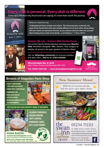 July 2025 | Phonebox Magazine 29fifffffflffifl%u001a%u0019%u0018%u0019%u0017%u0016%u0019%u0015%u0017%u0014%u0017%u0013%u0015%u0012%u0018%u0018fifffflffifl%u001a%u0019%u0018%u0017%u0017%u0019%u0016fl%u0015%u0017ffi%u0019%u0014ffi%u0016fl%u0013%u0014%u0018%u0019%u0012ff%u0011%u0010%u0019%u0014ffifl%u0013%u0013%u000ffl%u000e%u0015%u0011fl%u0018%u0010%u0017%u000f%u000e%u000f%u000c%u0017%u000f%u000f%u0017%u000b%u000e%u0017%u0017%u0017%u0017%u0009fffffflffifl%u001a%u0019%u0018%u0019%u0008%u0019%u0015%u0019%u0007%u0006%u0005%u0015%u0012%u0018%u0018%u0004fflff%u0004%u0003fifffffflffiflff%u001a%u0019%u0019%u0019%u0018%u0017%u0016%u0015%u0014%u0013ffi%u0012ffffi%u0011%u0010%u000f%u000effl%u0015%u000c%u0001fl%u0015%u0081%u0017%u0012%u008d%u0012%u008f%u0017%u0012%u008d%u0017%u0090fl%u0015%u008dff%u0007%u0019%u0018%u0004%u0017%u0001fl%u0015%u0081%u0017%u0006%u0012%u008dffi%u0017%u0012%u008d%u0017%u0006%u0012%u009d%u0017fl%u0015fl%u0007%u008f%u0004%u000c%u0014%u0011%u0017flffffi%u000bfl%u000bffl%u0009%u0014%u0008%u0017%u0018fl%u0007%u0012%u0006fl%u0005%u0014%u0014%u000bfl%u0004%u0014%u0008%u0017%u0018flff%u0018%u0017flff%u0006fflffi%u0003flffl%u0019fl%u0011%u0014%u0018%u0017fl%u0019%u0012ffffifl%u0007%u0014%u0018%u0019%u0012fl%u0019%u0012%u0017fl%u0001%u0014%u0018ffi%u0017%u0006%u0081%u008d%u0014fflffifl%u0014%u0018fl%u00a0ffi%u0019%u008f%u008d%u00ad%u0090%u0090%u0017fflff%u0009%u0009%u0003%u0007%u0012%u008f%u0081%u0017%u0005%u0014%u0018fl%u0017%u008f%u0009%u0004ffl%u0008%u0017fl%u0010%u000bff%u0019%u0017flffffi%u000bfl%u0019ff%u0090%u0004%u0017fl%u0014%u009dfl%u0017%u0018%u0081flfl%u00ad%u0006%u0006%u0017%u0003%u008d%u0017ff%u0007%u0010%u0017%u000f%u0080%u000b%u000c%u0082%u0017%u0083%u0083%u0083%u0084%u000b%u0084%u0085%u0003%u0007%u0006%u0019%u0081%u0017%u000e%u0082%u008fffi%u0017%u0086%u0003%u0018%u0081%u0017%u0087%u0017%u0085%u0003%u0009%u0009fl%u0015%u0017%u0016%u0016%u0088%u0017%u0013%u0019%u0015%u0006fl%u0007%u0017%u0001fl%u0007%u008f%u000bff%u000fflffi%u0010%u0013ffi%u0009ff%u0008ffi%u0007%u0006%u0008ffiff%u0009ffi%u0005%u0009%u000fflffl%u0013ffi%u0017%u0004ffi%u0004%u0003%u0014ffi%u0016%u0017%u0009ffi%u0017fl%u0005ffi%u0014fl%u0001ffffiff%u0010%u0009ffififffffflffifl%u0017%u00a0%u0019%u0018%u0019ffi %u0017ff%u0010%u0009%u000f%u0004%u0014%u0013ffi %u0017%u0015fffl%u0012%u0013%u000f%u0005%u0014ffi fifi%u0081ffi %u000e%u0015%u0017%u0013%u0013%u000f%u000e%u0013%u008dffi %u0009ff%u0008ffi %u0016%u0010%u0009%u0012%u0014%u0009%u0013ffi %u0004ffffiffl%u0014%u0016%u0017%u0016%u0013ffi%u0017%u0015%u0015ffi%u0013%u0014%u0009%u0014%u0005ffi%u000fflffi%u0004%u0003%u0014ffiff%u0006%u0014flffi%u0012%u0017%u0009%u0005%u0014fl%u0013ffiffffi%u008f%u0014fl%u0004ffflffi%u000f%u0015%u0015%u0017%u0012%u0014%u0019%u201cA Bangladeshi feast of taste and culture. The food exquisite, cooked by the head of the family. Each dish was notably diff erent from each other. All excelling! We won%u2019t share our personal choices, as you need to discover them for yourself. Worth taking time to talk to the family %u2013 a rich history.%u201d F. West, 06/25What our customers say:ffl%u0014%u0016%u0017%u0016%u0013ffi%u0017%u0015%u0015ffi%u0013%u0014%u0009%u0014%u0005ffi%u000fflffi%u0004%u0003%u0014ffiff%u0006%u0014flffi%u0012%u0017%u0009%u0005%u0014fl%u0013ffiffffi%u008f%u0014fl%u0004ffflffi%u000f%u0015%u0015%u0017%u0012%u0014%u0019%u0005%u0014%u0018fl%u0017%u008f%u0009%u0004ffl%u0008%u0017fl%u0010%u000bff%u0019%u0017fl12 High Street South, Olney, Buckinghamshire MK46 4AA01234 711111New Summer Menu!www.theswanolney.co.ukFind us on FacebookThe Swan Inn & BistroWith lots of seasonal specials and new great value lighter dishes LICENSED TEAROOM & GARDEN SERVING LIGHT LUNCHES, HOMEMADE CAKES, HOT & COLD DRINKSBrowns of Stagsden Farm Shop %u2022 QUALITY HOME REARED LOCAL MEAT AND POULTRY%u2022 FRESH FRUIT & VEGETABLES %u2022 HOMEMADE PIES%u2022 WIDE SELECTION OF ARTISAN CHEESE%u2022 EXTENSIVE RANGE OF TASTY ACCOMPANIMENTS GET SIZZLING WITH OUR FANTASTIC RANGE OF BBQ MEATSwww.brownsofstagsden.co.ukFollow us on Facebook and Instagram for updatesManor Farm, Stagsden, Beds, MK43 8SHTue - Thurs 10am - 4pm, Fri 10am - 5pm, Sat 9am - 3pm01234 822330