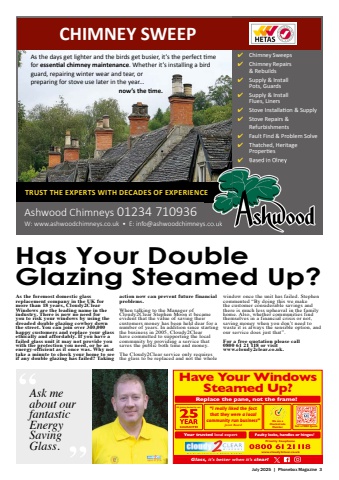 July 2025 | Phonebox Magazine 3Replace the pane, not the frame!Have Your Windows Steamed Up?Your trusted local expert Faulty locks, handles or hinges?Priority freephonewww.cloudy2clear.co.ukAll glazing backed by our %u201cI really liked the fact that they were a local community run business%u201dJanet BeardWe are a CheckatradeMember Get a FREE QuoteGlass, it%u2019s better when it%u2019s clear! Has Your Double Glazing Steamed Up?Ask me about our fantastic Energy Saving Glass.As the foremost domestic glass replacement company in the UK for more than 18 years, Cloudy2Clear Windows are the leading name in the industry. There is now no need for you to risk your windows by using the dreaded double glazing cowboy down the street. You can join over 340,000 happy customers and replace your glass ethically and affordably. If you have a failed glass unit it may not provide you with the protection you need, or be as energy-efficient as it once was. Why not take a minute to check your home to see if any double glazing has failed? Taking action now can prevent future financial problems.When talking to the Manager of Cloudy2Clear Stephen Moon it became evident that the value of saving their customers money has been held dear for a number of years. In addition since starting the business in 2005, Cloudy2Clear have committed to supporting the local community by providing a service that saves the public both time and money.The Cloudy2Clear service only requires the glass to be replaced and not the whole window once the unit has failed. Stephen commented %u201cBy doing this we make the customer considerable savings and there is much less upheaval in the family home. Also, whether communities find themselves in a financial crisis or not, saving money when you don%u2019t need to waste it is always the sensible option, and our service does just that%u201d.For a free quotation please call 0800 61 21 118 or visit www.cloudy2clear.co.uk.Ashwood Chimneys 01234 710936W: www.ashwoodchimneys.co.uk %u2022 E: info@ashwoodchimneys.co.uk%u2714 Chimney Sweeps%u2714 Chimney Repairs & Rebuilds%u2714 Supply & Install Pots, Guards%u2714 Supply & Install Flues, Liners%u2714 Stove Installati on & Supply %u2714 Stove Repairs & Refurbishments %u2714 Fault Find & Problem Solve %u2714 Thatched, Heritage Properti es%u2714 Based in OlneyCHIMNEY SWEEPW: www.ashwoodchimneys.co.uk %u2022 E: info@ashwoodchimneys.co.ukTRUST THE EXPERTS WITH DECADES OF EXPERIENCEAs the days get lighter and the birds get busier, it%u2019s the perfect ti me for essenti al chimney maintenance. Whether it%u2019s installing a bird guard, repairing winter wear and tear, or preparing for stove use later in the year... now%u2019s the ti me.