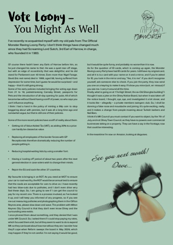 34 Phonebox Magazine | July 2025I%u2019ve recently re acquainted myself with my old pals from The Offi cial Monster Raving Loony Party. I don%u2019t think things have changed much since they had Screaming Lord Sutch, 3rd Earl of Harrow, in charge, who founded it in 1983.See you next month!Dave%u2026 Of course there hadn%u2019t been any Earls of Harrow before him, as he just changed his name to that. He was a quiet man off stage, but with an edge of eccentricity that was delightful, and he did stand for Parliament over 40 times. Even more than Nigel Farage. David (his real name) died in 1999, aged 58, having suff ered from depression for some time, but I guess he would be surprised %u2013 and happy %u2013 that it%u2019s still going strong.Some of his early policies included bringing the voting age down from 21 to 18, pedestrianising Carnaby Street, passports for Pets and the introduction of all-day opening for pubs. All of which became law without David having a sniff of power, so who says you can%u2019t infl uence anything.I think I had a hand in the policy of minting a 99p coin to stop beggaring about with pennies, but it was all a long time ago and somewhat vague, but that is still one of their policies.Some of the more recent policies have a sniff of reality about them.%u2022 Getting rid of Value Added Tax (VAT), as adding 20% to a price can hardly be classed as value.%u2022 Replacing all employees of the border forces with GP Receptionists therefore dramatically reducing the number of people getting in.%u2022 Reducing hospital waiting lists by using a smaller font.%u2022 Having a %u2018cooling off %u2019 period of about two years after the next general election in case voters wish to change their minds.%u2022 Rejoin the EU and sack the other 27 countries.My favourite is bringing in an ROT. As you need an MOT to ensure your car is road-worthy, the ROT would be an annual test to ensure that the roads are acceptable for cars to drive on. I have recently had two blow-outs due to potholes, and I don%u2019t even drive very fast these days. So, I am going to see if I can get the council to pay for my recent one. There is a process involved, as I%u2019ve looked it up, and I will keep you informed of any progress, so if you see me out measuring potholes and photographing them in the Clifton Reynes area, please slow down and wave. The problem with Milton Keynes City Council is that they don%u2019t even know Olney and the surrounding area exists.I once phoned them about something, and they denied that I was under MK Council. So, I asked them if I could stop paying my rates, which focused them a bit, but all they seem to want to do is expand MK so they can boast about how marvellous they are. I wonder how they%u2019ll cope when Reform sweeps the board in May 2026, which may happen if they%u2019re not careful. I%u2019m not saying it would be good, but it would be quite funny, and probably no worse than it is now.As for the question of ID cards, which is coming up again, the Monster Raving Loony Party have had ID cards for years. I still have my original card, and all it is is a card with your name on it and a mirror, and if you%u2019re asked for ID, you look in the mirror and say, %u201cYes, it is me%u201d. If you don%u2019t recognise yourself, ask someone else to check. If you join the party, they now send you one on a keyring to make it easy. I%u2019ll show you mine (ooh, err missus) if you see me. I carry it around all the time.Finally, what is going on at 17a High Street, the ex-Old Shanghai building? I thought it was a joke on the Olney Notice Board, but when it was taken off the notice board, I thought, aye, aye, and investigated it a bit closer, and it looks like %u2013 allegedly %u2013 a private members swingers club. So, I shall be donning a false nose and moustache and joining. It%u2019s quite exciting, really, and it makes a change from people moaning about Turkish barbers and Nail Bars.I think it%u2019s MK Council you must contact if you want to object, by the 7th of July, and not Olney Town Council, as they have no powers over commercial businesses taking on a property. They can have a say in the frontage, now that could be interesting.In the meantime I%u2019m now on Amazon, looking at disguises.