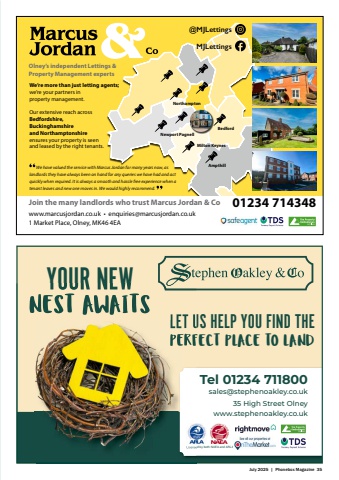 July 2025 | Phonebox Magazine 35Licensed by both NAEA and ARLATel 01234 711800sales@stephenoakley.co.uk35 High Street Olneywww.stephenoakley.co.ukLET US HELP YOU FIND THE PERFECT PLACE TO LANDYOUR NEWNEST AWAITSLicensed by both NAEA and ARLAMJLettings@MJLettingsOlney%u2019s independent Lettings & Property Management expertsWe%u2019re more than just letting agents;we%u2019re your partners in property management. Our extensive reach across Bedfordshire, Buckinghamshire and Northamptonshireensures your property is seen and leased by the right tenants. We have valued the service with Marcus Jordan for many years now, as landlords they have always been on hand for any queries we have had and act quickly when required. It is always a smooth and hassle free experience when a tenant leaves and new one moves in. We would highly recommend.NorthamptonNewport PagnellMilton KeynesAmpthillBedfordJoin the many landlords who trust Marcus Jordan & Co 01234 714348www.marcusjordan.co.uk %u2022 enquiries@marcusjordan.co.uk1 Market Place, Olney, MK46 4EA