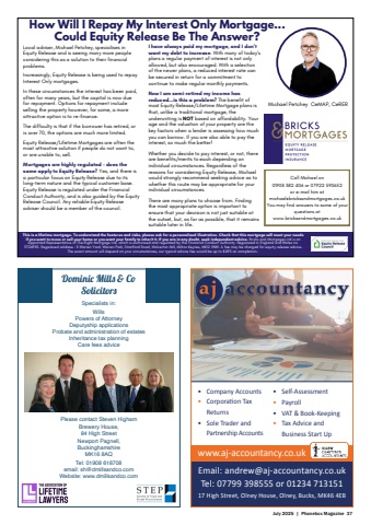 July 2025 | Phonebox Magazine 37%u2022 Company Accounts%u2022 Corporati on Tax Returns%u2022 Sole Trader and Partnership AccountsEmail: andrew@aj-accountancy.co.ukTel: 07799 398555 or 01234 71315117 High Street, Olney House, Olney, Bucks, MK46 4EB%u2022 Self-Assessment%u2022 Payroll%u2022 VAT & Book-Keeping%u2022 Tax Advice and Business Start Upwww.aj-accountancy.co.ukDominic Mills & CoSolicitorsSpecialists in:WillsPowers of AttorneyDeputyship applicationsProbate and administration of estatesInheritance tax planningCare fees advicePlease contact Steven HighamBrewery House, 84 High StreetNewport Pagnell, BuckinghamshireMK16 8AQTel: 01908 618708email: sh@dmillsandco.comWebsite: www.dmillsandco.comI have always paid my mortgage, and I don%u2019twant my debt to increase. With many of today%u2019splans a regular payment of interest is not onlyallowed, but also encouraged. With a selectionof the newer plans, a reduced interest rate canbe secured in return for a commitment tocontinue to make regular monthly payments.Now I am semi-retired my income hasreduced...is this a problem? The benefit ofmost Equity Release/Lifetime Mortgage plans isthat, unlike a traditional mortgage, theunderwriting is NOT based on affordability. Yourage and the valuation of your property are thekey factors when a lender is assessing how muchyou can borrow. If you are also able to pay theinterest, so much the better!Whether you decide to pay interest, or not, thereare benefits/merits to each depending onindividual circumstances. Regardless of thereasons for considering Equity Release, Michaelwould strongly recommend seeking advice as towhether this route may be appropriate for yourindividual circumstances.There are many plans to choose from. Findingthe most appropriate option is important toensure that your decision is not just suitable atthe outset, but, as far as possible, that it remainssuitable later in life.Local adviser, Michael Petchey, specialises inEquity Release and is seeing many more peopleconsidering this as a solution to their financialproblems.Increasingly, Equity Release is being used to repayInterest Only mortgages.In these circumstances the interest has been paid,often for many years, but the capital is now duefor repayment. Options for repayment includeselling the property however, for some, a moreattractive option is to re-finance.The difficulty is that if the borrower has retired, oris over 70, the options are much more limited.Equity Release/Lifetime Mortgages are often themost attractive solution if people do not want to,or are unable to, sell.Mortgages are highly regulated %u2013 does thesame apply to Equity Release? Yes, and there isa particular focus on Equity Release due to itslong-term nature and the typical customer base.Equity Release is regulated under the FinancialConduct Authority, and is also guided by the EquityRelease Council. Any reliable Equity Releaseadviser should be a member of the council.Call Michael on01908 382 406 or 07922 590652or e-mail him atmichael@bricksandmortgages.co.ukYou may find answers to some of yourquestions atwww.bricksandmortgages.co.ukMichael Petchey CeMAP, CeRERHow Will I Repay My Interest Only Mortgage...Could Equity Release Be The Answer?This is a lifetime mortgage. To understand the features and risks, please ask for a personalised illustration. Check that this mortgage will meet your needsif you want to move or sell your home or you want your family to inherit it. If you are in any doubt, seek independent advice. Bricks and Mortgages Ltd is anAppointed Representative of The Right Mortgage Ltd, which is authorised and regulated by the Financial Conduct Authority. Registered in England and Wales no.11726935. Registered address : 3 Warren Yard, Warren Park, Stratford Road, Wolverton Mill, Milton Keynes, MK12 5NW. A fee may be charged for equity release advice.The exact amount will depend on your circumstances, our typical advice fee would be up to %u00a3495 on completion..