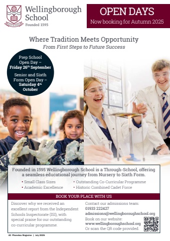 40 Phonebox Magazine | July 2025Where Tradition Meets Opportunity From First Steps to Future SuccessOPEN DAYSNow booking for Autumn 2025Founded in 1595 Wellingborough School is a Through-School, offering a seamless educational journey from Nursery to Sixth Form. Discover why we received an excellent report from the Independent Schools Inspectorate (ISI), with special praise for our outstanding co-curricular programme.%u2022 Small Class Sizes%u2022 Academic ExcellenceBOOK YOUR PLACE WITH US %u2022 Outstanding Co-Curricular Programme%u2022 Historic Combined Cadet ForceContact our admissions team:01933 222427admissions@wellingboroughschool.orgBook on our website: www.wellingboroughschool.orgOr scan the QR code provided.Prep School Open Day %u2013 Friday 26th SeptemberSenior and Sixth Form Open Day %u2013 Saturday 4thOctober
