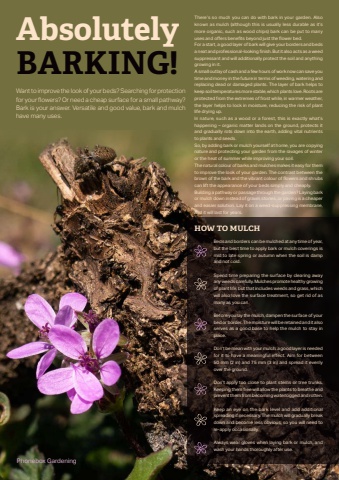 42 Phonebox Magazine | July 2025Want to improve the look of your beds? Searching for protection for your fl owers? Or need a cheap surface for a small pathway? Bark is your answer. Versatile and good value, bark and mulch have many uses.AbsolutelyBARKING!There%u2019s so much you can do with bark in your garden. Also known as mulch (although this is usually less durable as it%u2019s more organic, such as wood chips) bark can be put to many uses and off ers benefi ts beyond just the fl ower bed.For a start, a good layer of bark will give your borders and beds a neat and professional-looking fi nish. But it also acts as a weed suppressant and will additionally protect the soil and anything growing in it.A small outlay of cash and a few hours of work now can save you time and money in the future in terms of weeding, watering and replacing dead or damaged plants. The layer of bark helps to keep soil temperatures more stable, which plants love. Roots are protected from the extremes of frost while, in warmer weather, the layer helps to lock in moisture, reducing the risk of plant life drying up.In nature, such as a wood or a forest, this is exactly what%u2019s happening %u2013 organic matter lands on the ground, protects it and gradually rots down into the earth, adding vital nutrients to plants and seeds. So, by adding bark or mulch yourself at home, you are copying nature and protecting your garden from the ravages of winter or the heat of summer while improving your soil.The natural colour of barks and mulches makes it easy for them to improve the look of your garden. The contrast between the brown of the bark and the vibrant colour of fl owers and shrubs can lift the appearance of your beds simply and cheaply.Building a pathway or passage through the garden? Laying bark or mulch down instead of gravel, stones, or paving is a cheaper and easier solution. Lay it on a weed-suppressing membrane, and it will last for years.HOW TO MULCHBeds and borders can be mulched at any time of year, but the best time to apply bark or mulch coverings is mid to late spring or autumn when the soil is damp and not cold.Spend time preparing the surface by clearing away any weeds carefully. Mulches promote healthy growing of plant life, but that includes weeds and grass, which will also love the surface treatment, so get rid of as many as you can.Before you lay the mulch, dampen the surface of your bed or border. The moisture will be retained and it also serves as a good base to help the mulch to stay in place.Don%u2019t be mean with your mulch: a good layer is needed for it to have a meaningful eff ect. Aim for between 50 mm (2 in) and 75 mm (3 in) and spread it evenly over the ground.Don%u2019t apply too close to plant stems or tree trunks. Keeping them free will allow the plants to breathe and prevent them from becoming waterlogged and rotten.Keep an eye on the bark level and add additional spreading if necessary. The mulch will gradually break down and become less obvious, so you will need to re-apply occasionally. Always wear gloves when laying bark or mulch, and wash your hands thoroughly after use.Phonebox Gardening