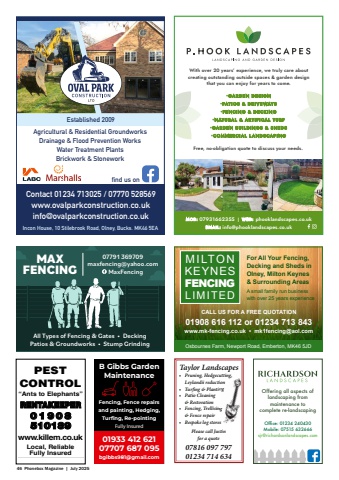 46 Phonebox Magazine | July 2025CALL US FOR A FREE QUOTATION 01908 616 112 or 01234 713 843 www.mk-fencing.co.uk %u2022 mk1fencing@aol.comMILTONKEYNESFENCINGLIMITEDOsbournes Farm, Newport Road, Emberton, MK46 5JDFor All Your Fencing, Decking and Sheds in Olney, Milton Keynes & Surrounding Areas A small family run business with over 25 years experienceAll Types of Fencing & Gates %u2022 DeckingPatios & Groundworks %u2022 Stump GrindingMAXFENCING07791 369709maxfencing@yahoo.com MaxFencing%u2022 Pruning, Hedgecutting, Leylandii reduction%u2022 Turfi ng & Planting%u2022 Patio Cleaning & Restoration%u2022 Fencing, Trellising & Fence repair%u2022 Bespoke log storesTaylor LandscapesPlease call Justin for a quote07816 097 79701234 714 634Leylandii reduction%u2022 Turfi ng & Planting%u2022 Fencing, Trellising PESTCONTROL %u201cAnts to Elephants%u201dRENTAKEEPER01 90 8510189www.killem.co.ukLocal, ReliableFully InsuredMOB: 07931662355 | WEB: phooklandscapes.co.ukEMAIL: info@phooklandscapes.co.ukWith over 20 years%u2019 experience, we truly care about creating outstanding outside spaces & garden design that you can enjoy for years to come. Free, no-obligation quote to discuss your needs.%u2022GARDEN DESIGN%u2022PATIOS & DRIVEWAYS%u2022FENCING & DECKING%u2022NATURAL & ARTIFICAL TURF%u2022GARDEN BUILDINGS & SHEDS%u2022COMMERCIAL LANDSCAPINGOffering all aspects of landscaping from maintenance to complete re-landscapingOffice: 01234 240430 Mobile: 07515 632666sjr@richardsonlandscapes.comFencing, Fence repairs and painting, Hedging, Turfing, Re-pointingFully InsuredB Gibbs Garden Maintenance01933 412 62107707 687 095bgibbs981@gmail.comAgricultural & Residential GroundworksDrainage & Flood Prevention WorksWater Treatment PlantsBrickwork & StoneworkEstablished 2009www.ovalparkconstruction.co.ukinfo@ovalparkconstruction.co.ukIncon House, 10 Stilebrook Road, Olney, Bucks. MK46 5EAfind us onContact 01234 713025 / 07770 528569