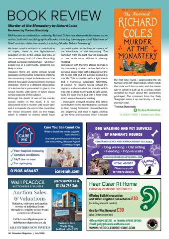 50 Phonebox Magazine | July 2025His latest novel is written in a combination of styles; there is the light-hearted depiction of life in the village and also in the monastery, both of them illustrating diffi cult personal relationships %u2013 wherever people live in a community, problems are likely to arise. However, there are some almost lyrical passages as the author describes entering the monastery chapel in darkness and the eff ect it has upon Canon Clement, his main character. There is a detailed description of a lecture he is persuaded to give to the novice monks, with some %u2018in-jokes%u2019 about certain aspects of the subject.Although the death of one of the monks occurs earlier in the book, it is not discovered to be a murder until much later and it is towards the end of the novel that the mood becomes dark as the tragic death is related to events which have Reviewed by Thelma ShackladyMurder at the Monastery by Richard ColesWell known as a television celebrity, Richard Coles has also made his name as an author, both with autobiographical books, including the very personal %u2018Madness of Grief%u2019 and also detective novels, including %u2018Murder Before Evensong%u2019. occurred earlier in the lives of several of the inhabitants of the monastery. The transition from the light-hearted approach to one much more sinister is cleverly handled.Interwoven with the time Daniel spends in the monastery, to which he has fl ed after a personal crisis, there is the depiction of the life he has left and the people involved in that life. This is handled with a light touch and a humorous approach. Ultimately, of course, he returns having solved the mystery and unravelled the threads which lead into a rather murky past, to take up his daily life once more, but with a fi nal twist, which leaves the reader smiling.I thoroughly enjoyed reading this latest contribution from a talented writer, so much so that, having fi nished it, I turned back to the beginning and read it again, picking up the hints and nuances which I missed BookshopTel: 01234 714592 | Stanley Court, OlneyBOOK REVIEWthe fi rst time round. I appreciated the sly humour and self-deprecation which made the book such fun to read, and the clever way in which it built up to a climax which revealed so much about the characters portrayed. The comment from the Daily Telegraph sums it up succinctly %u2013 %u2018A very moreish read%u2019.Thelma ShackladyWWW.HEARCLEARATHOME.COMOffice: 01604 357291 or Mobile: 07909 291993Email: polly@hearclearathome.comHear Clear At HomeEARWAX REMOVAL SPECIALISTOffering Both Microsuction and Water Irrigation Consultation %u00a310(including referral if needed)One Ear Wax Removal %u00a330(plus %u00a310 for second ear)DOG WALKING AND PET SERVICESBY HANNAH%u2019S HOUNDSCOVERING OLNEY AND SURROUNDING VILLAGES%u2022 Dog walking %u2022 Cat sitting %u2022 Feeding %u2022 Pop-in visits07841 486087HANNAHSHOUNDSOLNEY@GMAIL.COMGive us a callfor more detailsCOVERING OLNEY AND SURROUNDING VILLAGES icaremk.comWhen a loved one needs support, trust mattersCare You Can Count OnPost-hospital recoveryComplex conditions24/7 live-in careEar syringingI Care MK provides nurse-led home care across Olney, Newport Pagnell & nearby villages01908 464487