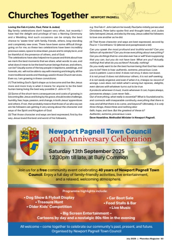 July 2025 | Phonebox Magazine 53Loving the Fab 4 (John, Paul, Peter & Judas)Big family celebrations don%u2019t happen very often, but recently I have had the delight and privilege of two: a Naming Ceremony and a Wedding. And such occasions can be simply the best chance to %u2018waste time%u2019 with family, friends, others, long-standing and completely new ones. There have been some diffi cult things going on for me, so these two celebrations have been incredibly precious oases, space to slow down, pause and to simply be in, and be thankful of, the presence of others, and of God.The celebrations have also helped me to pause and think about how we mark the best moments that we share, what words to use, and what does it mean to be the best human beings that we, and others, can be? Usually some of the key people in baptisms, weddings, and funerals, etc. will not be able to say with meaning and integrity all the more traditional words and theology used in those Church services. Even so, I am growing in these convictions: (1) That letting God%u2019s Spirit shape us to become and live like Jesus more and more truly is what it means for anyone to be the best human being living the best way possible (1 John 4:17);(2) Some of the short-term consequences and costs of growing in becoming like Jesus and living by his grace, should evoke challenge, humility, fear, hope, passion, and change, in both Jesus%u2019 apprentices and others. If not, that probably means that those of us who say we are his followers are getting it very wrong about the character and ways of the Spirit and Kingdom of God. (3) That those character and ways are best expressed, fi rst by the way Jesus loved the best and worst of his followers, e.g. %u2018the Fab 4%u2019: John (whom he loved), Paul (who initially persecuted Christians), Peter (who spoke fi rst and thought later), and Judas (who betrayed Jesus), and also by the way Jesus called his followers to love one another as he did.(4) That those character and ways are best expressed, second by Paul in 1 Corinthians 13 (altered and paraphrased a bit):Can you speak the most profound and truthful words? Can you fathom all mysteries? Can you know everything about everything? Can you do things that no-one else ever has or will? Even supposing that you can, but you do not have love: What are you? Actually, nothing! And what do you achieve? Actually, nothing!Do you really want to be the best human being that God has made you to be? Here is ho authentic, extreme, precarious: Love.Love is patient. Love is kind. It does not envy, it does not boast, it is not proud. It does not dishonour others, it is not self-seeking, it is not easily angered, and even if when it is, it keeps no record of wrongs. Love does not relish what%u2019s wrong but rejoices, delights, even dances with whatever turns out to be true. It protects whenever it must, trusts whenever it can, hopes always, perseveres always. Love never fails%u2026Out of everything, what really is essential? What is foundational to, and connects with inseparable continuity, everything that there is now, and all that there is to come, and beyond? Ultimately, it is only three things, these three and nothing else: faith, hope, and love. But the greatest of these is? Authentic, extreme, precarious: Love.Dave Haseldine, Methodist Minister in Newport Pagnell.Churches Together NEWPORT PAGNELLAll welcome %u2013 come together to celebrate our community%u2019s past, present, and future.Organised by Newport Pagnell Town CouncilNewport Pagnell Town Council40th Anniversary CelebrationSaturday 13th September 202512.30pm till late, at Bury CommonJoin us for a free community event celebrating 40 years of Newport Pagnell Town Council. Enjoy a full day of family-friendly activities, live entertainment, and a relaxed, welcoming atmosphere.%u2022 Dog Show & Flyball Display%u2022 Treasure Hunt%u2022 Older Kids%u2019 Competition%u2022 Car Boot Sale%u2022 Food Stalls & Bar%u2022 Live Music%u2022 Big Screen Entertainment %u2013 Cartoons by day and a nostalgic 80s fi lm in the eveningProgramme highlights include: