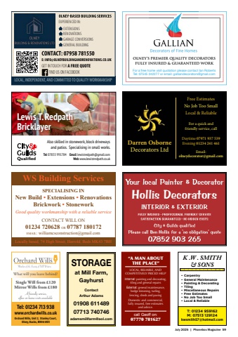 July 2025 | Phonebox Magazine 59WS Building ServicesSPECIALISING INNew Build %u2022 Extensions %u2022 RenovationsBrickwork %u2022 StoneworkGood quality workmanship with a reliable serviceCONTACT WILL ON01234 720628 OR 07787 180172email: williamcsconstruction@gmail.comLocally based, 74 High Street, Harrold, Beds MK43 7BHLewis T. RedpathBricklayerAlso skilled in stonework, block driveways and patios. Specialising in small works.Tel 07833 991784 Email lewistredpath@gmail.comQualified Web www.lewistredpath.co.ukDarren OsborneDecorators LtdFree EstimatesNo Job Too SmallLocal & ReliableFor a quick and friendly service, callDaytime 07971 937 539Evening 01234 241 461Email: olneydecorator@gmail.comHollis DecoratorsOlney%u2019s Premier Quality DecoratorsFully Insured & Guaranteed WorkFor a free home visit quotation please contact Ian RobertsTel: 07545 242277 or email: galliandecorators@gmail.comLOCAL, RELIABLE, AND COMPETITIVELY PRICED HELP Internal: painting and decorating,tiling and general repairsExternal: general maintenance, hedge trimming, turfing, fencing, sheds and pavingDomestic and commercial, fully insured, free estimates and advice.%u201cA MAN ABOUT THE PLACE%u201dcall Geoff on:07770 781627K .W . SMITH& SONS%u2022 Carpentry %u2022 General Maintenance%u2022 Painting & Decorating%u2022 Tiling%u2022 Miscellaneous Repairs%u2022 Free Estimates%u2022 No Job Too Small%u2022 Local & ReliableT: 01234 959162M: 07513 129124kwsmith57@hotmail.comEXPERIENCED IN: EXTENSIONSRENOVATIONS GARAGE CONVERSIONS GENERAL BUILDERCONTACT: 07958 781550 E: INFO@OLNEYBUILDINGANDRENOVATIONS.CO.UKGET IN TOUCH FOR A FREE QUOTE FIND US ON FACEBOOKLOCAL, INDEPENDENT, AND COMMITTED TO QUALITY WORKMANSHIPINGat Mill Farm,GayhurstContactArthur Adams01908 61148907713 740746adamsmillfarm@aol.comSTORAGEWhat will you leave behind?Single Will from %u00a3120Mirror Wills from %u00a3180 A friendly service, office or home visits availableTel: 01234 713 938www.orchardwills.co.ukOrchard Wills, Unit 2, Stanley Court, Olney, Bucks, MK46 5NH